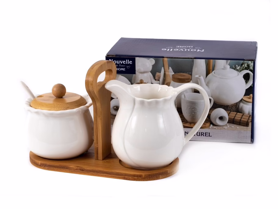 Сахарница с ложкой и сливочник на бамбуковой подставке "Naturel".