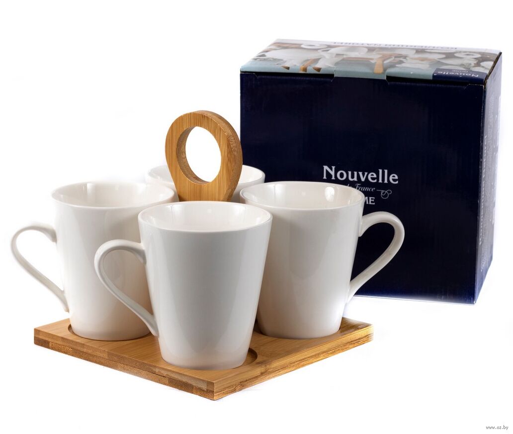 Набор выполнен из высококачественного фарфора и состоит из 4 кружек на деревянной подставке.