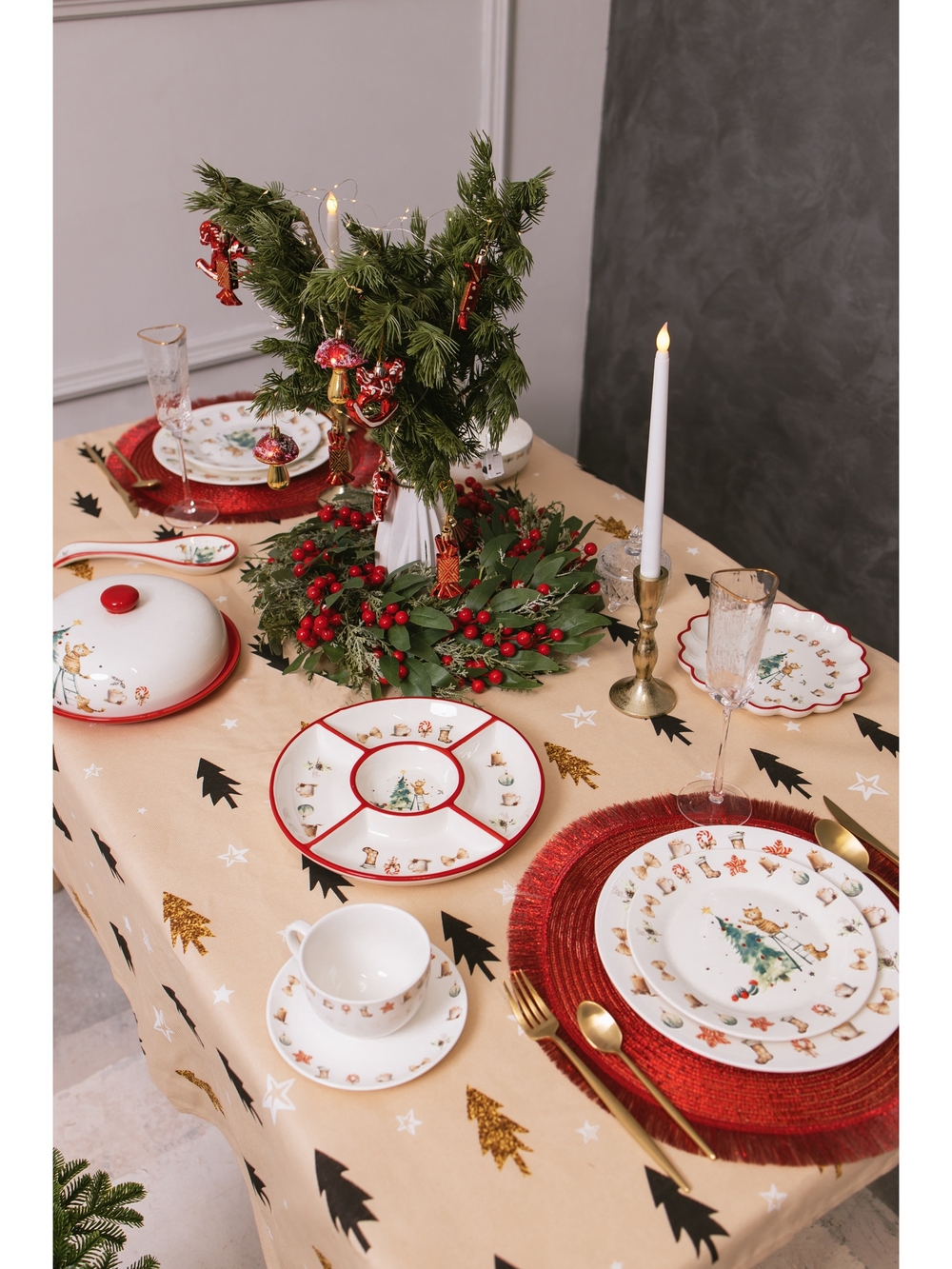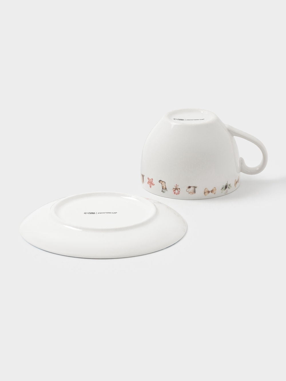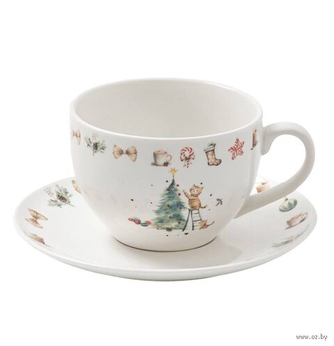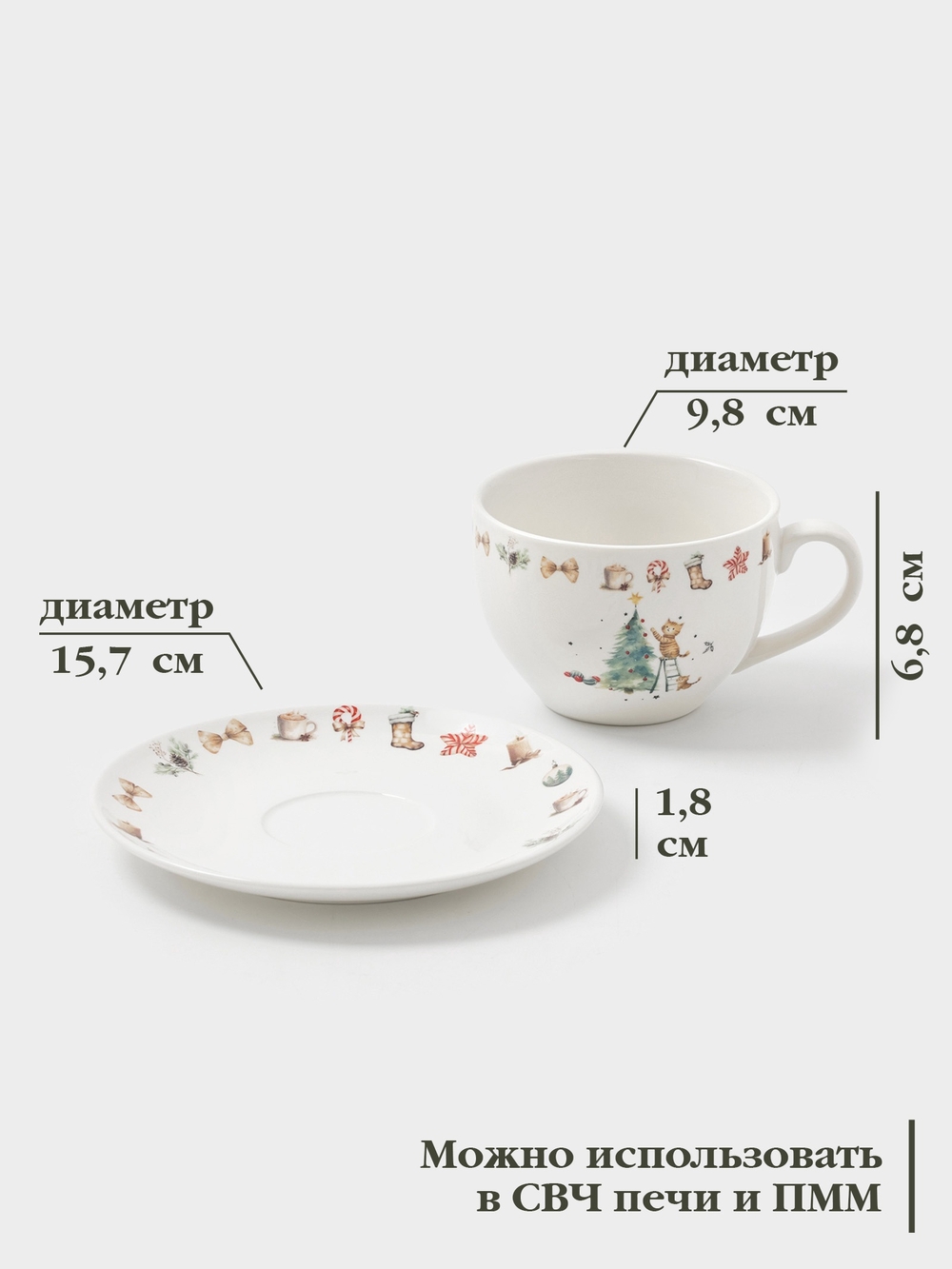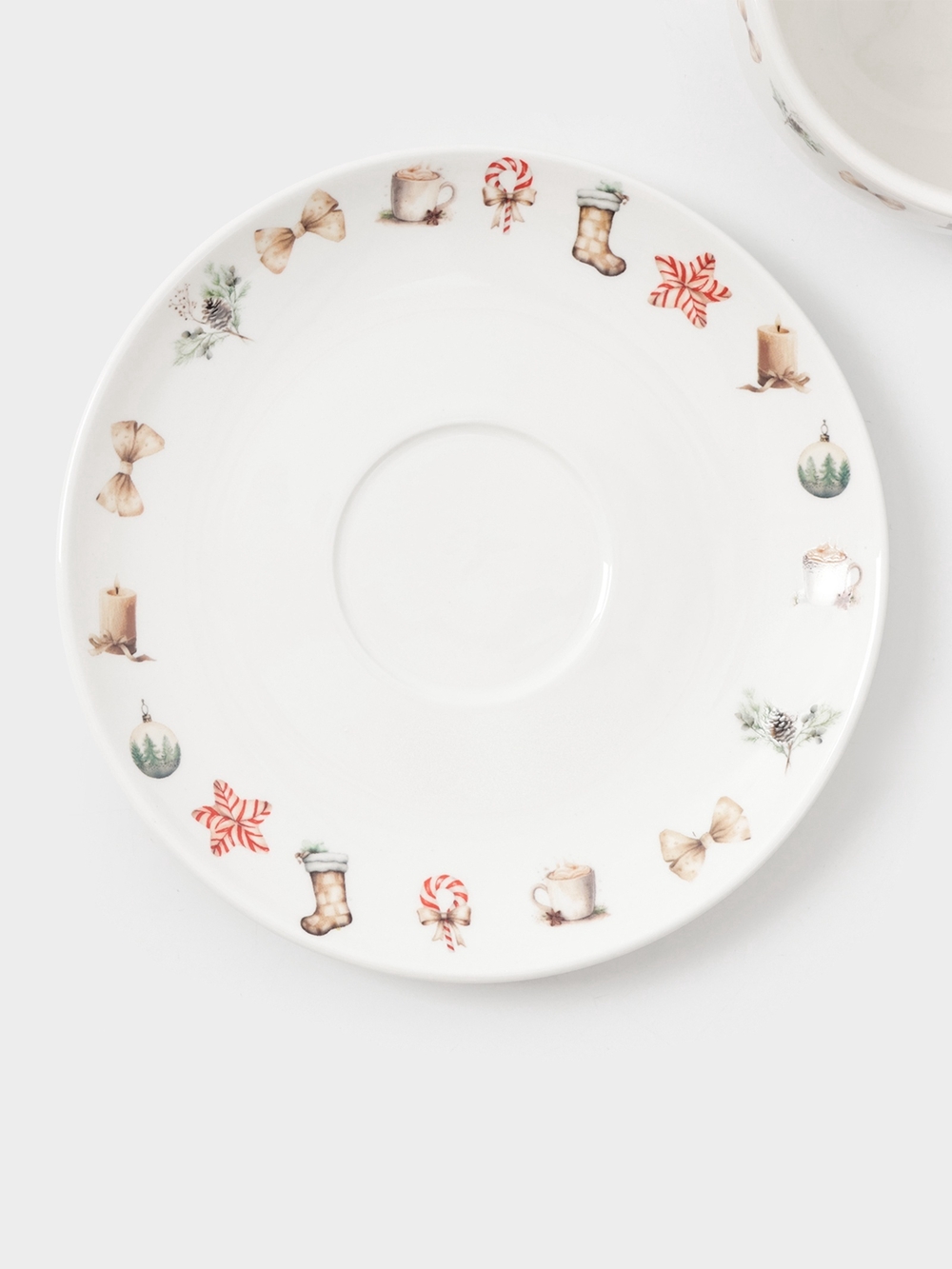 Новогодний "Праздничный чайный набор" станет незаменимым спутником ваших зимних чаепитий. Этот изысканный фарфоровый комплект, выполненный в элегантном белом цвете и украшенный праздничным рисунком, состоит из двух предметов – чашки объемом 210 мл и блюдца диаметром 15 см.