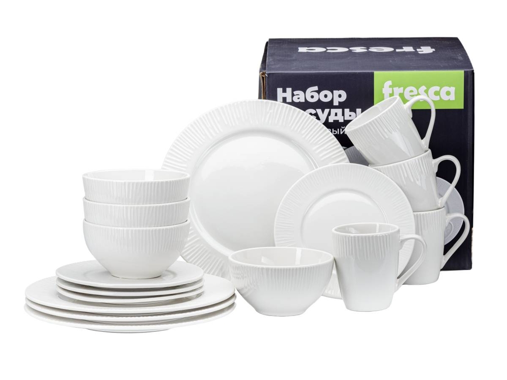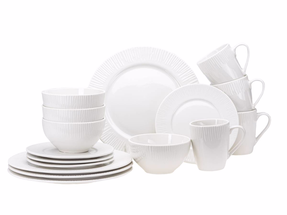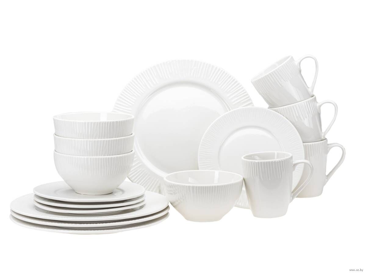 В наборе: 8 тарелок (19/26,5 см), 4 салатника (14 см), 4 кружки (350 мл).