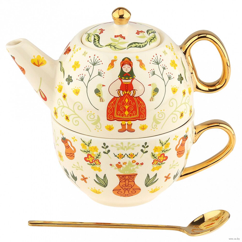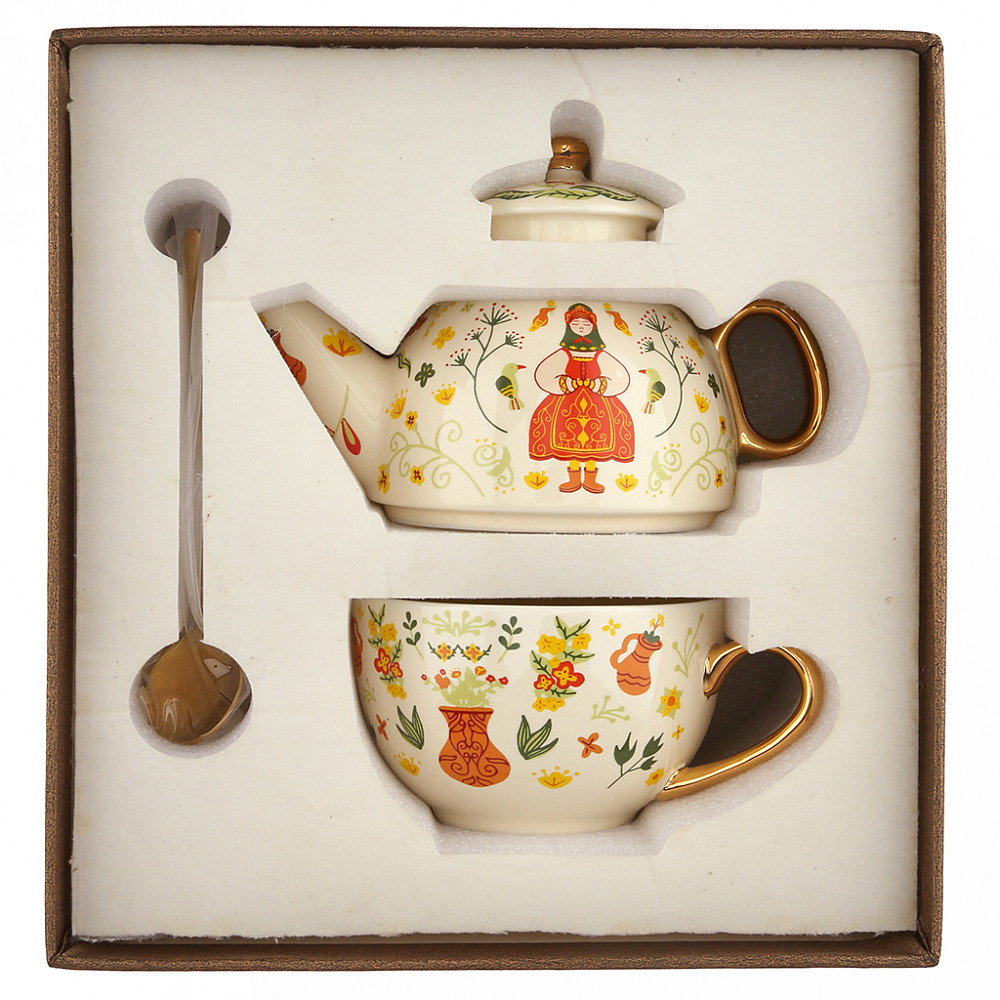 В наборе: чайник заварочный фарфоровый 260 мл (9,8х6 см); чашка фарфоровая 260 мл (9,7х6 см); ложка чайная металлическая 13 см.