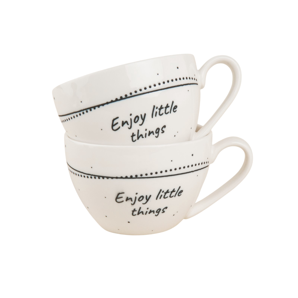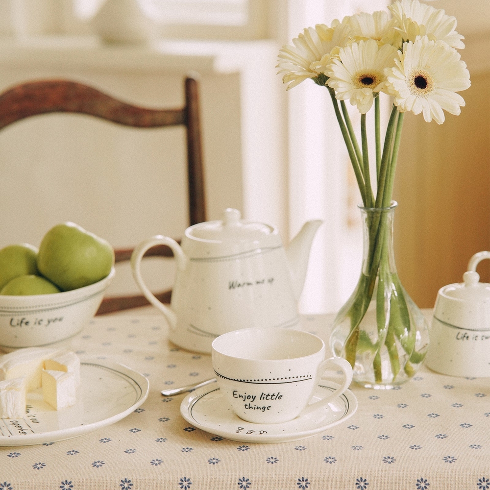 Белоснежная посуда с надписями, такими как "You are my sunshine" и "Enjoy little things", создаёт атмосферу уюта и тепла в вашем доме. Изящный рельеф и минималистичные линии вдохновлены стилем ручной керамики, который подчёркивает естественность и гармонию. Каждое изделие будто приглашает замедлиться и насладиться моментом.