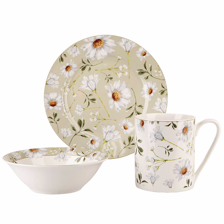 Коллекцию посуды из фарфора "Camila" – идеальный спутник для вашего стола. На каждой тарелке, чашке и блюде изображены нежные ромашки, которые пробуждают воспоминания о летней прогулке. И самое лучшее – все это упаковано в элегантную подарочную коробку, готовую стать идеальным подарком!