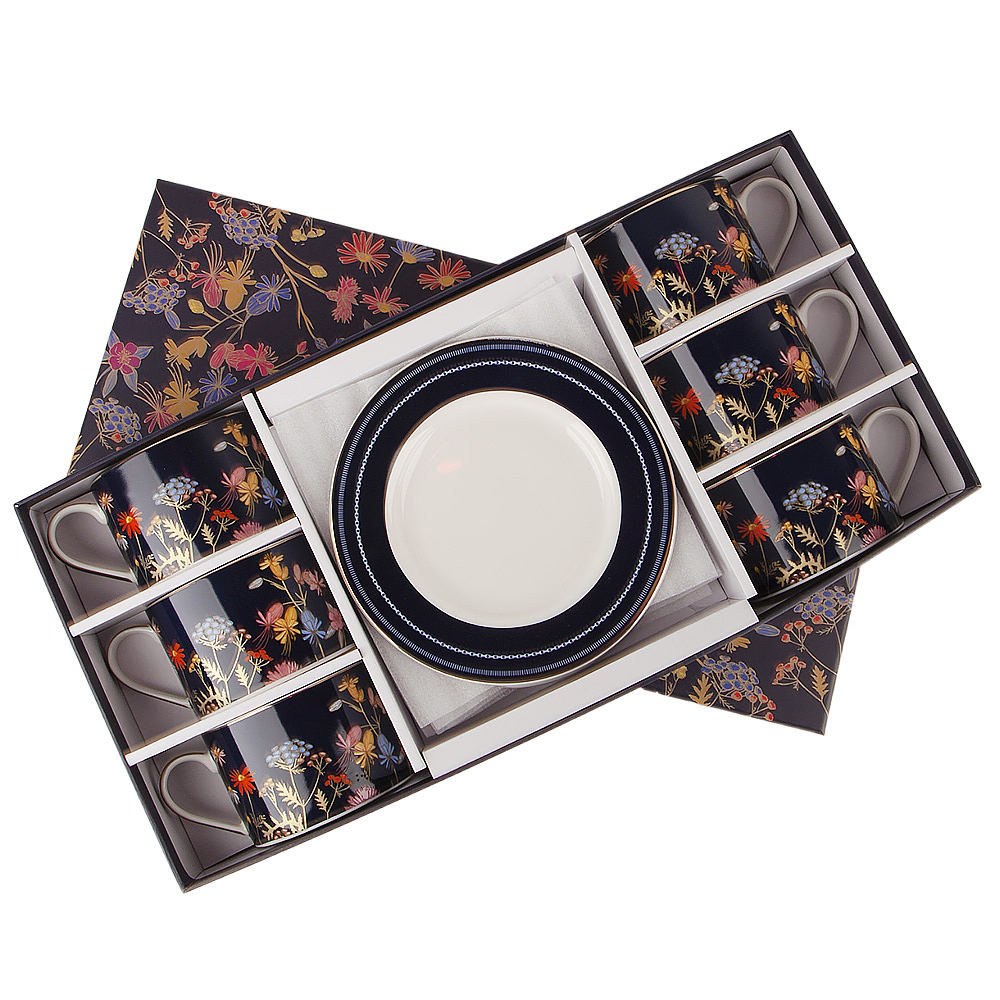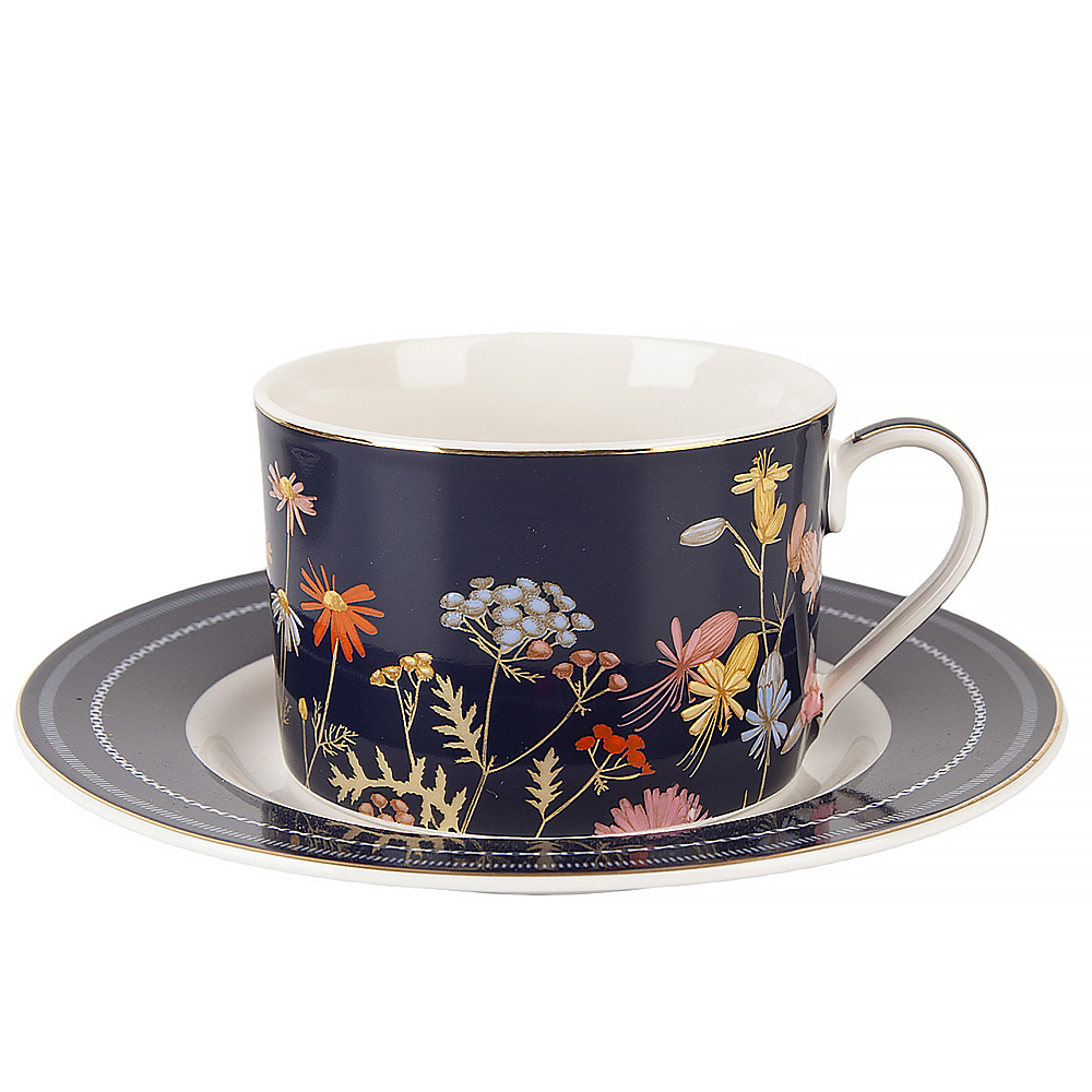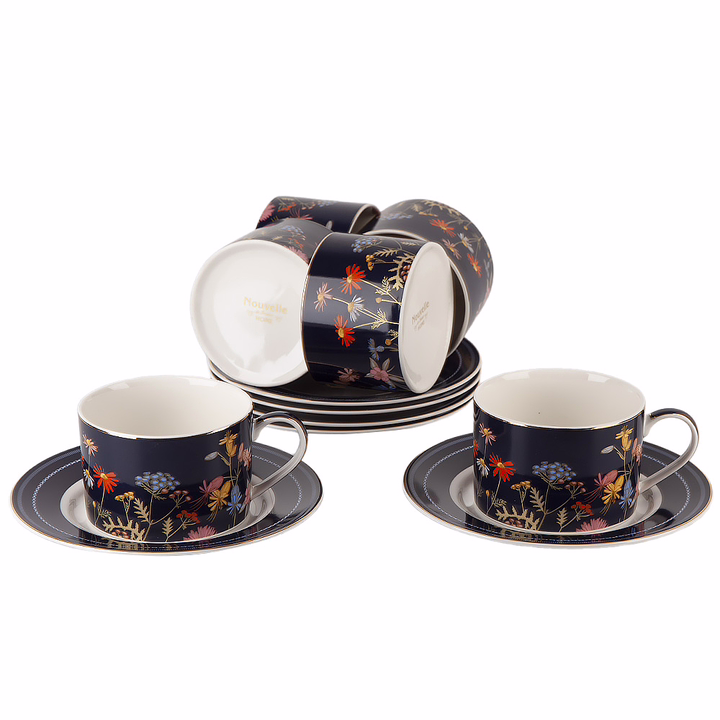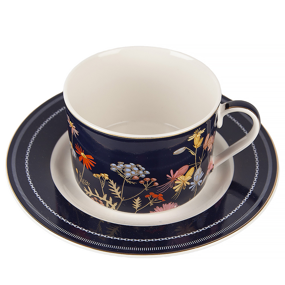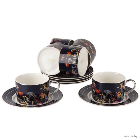 Представляем вашему вниманию утонченную коллекцию посуды из фарфора "Grace", которая непременно станет изысканным украшением вашего стола. Каждый предмет этой коллекции украшен изящным дизайном цветов на глубоком синем фоне, дополненным элегантным золотым декором. Эта посуда придает особый шарм и роскошь вашему сервированному столу.