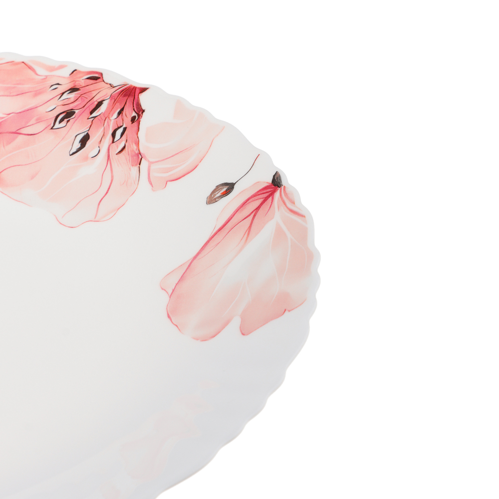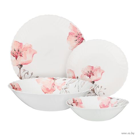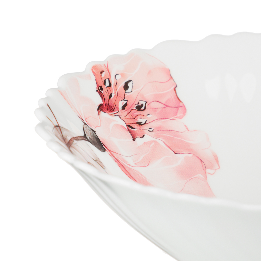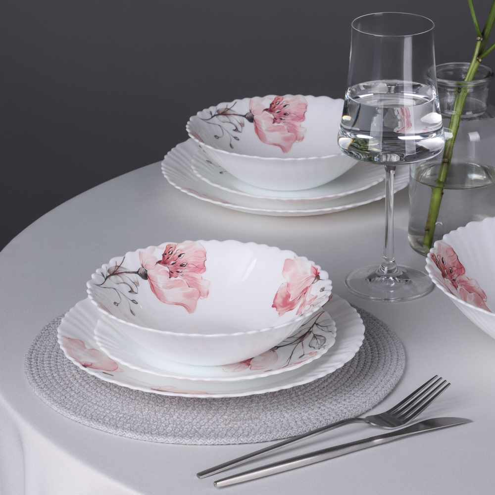 Нежный рисунок с розовыми цветами на белом фоне придает каждой тарелке особую утонченность, превращая обычную трапезу в праздник.