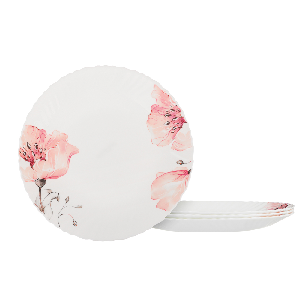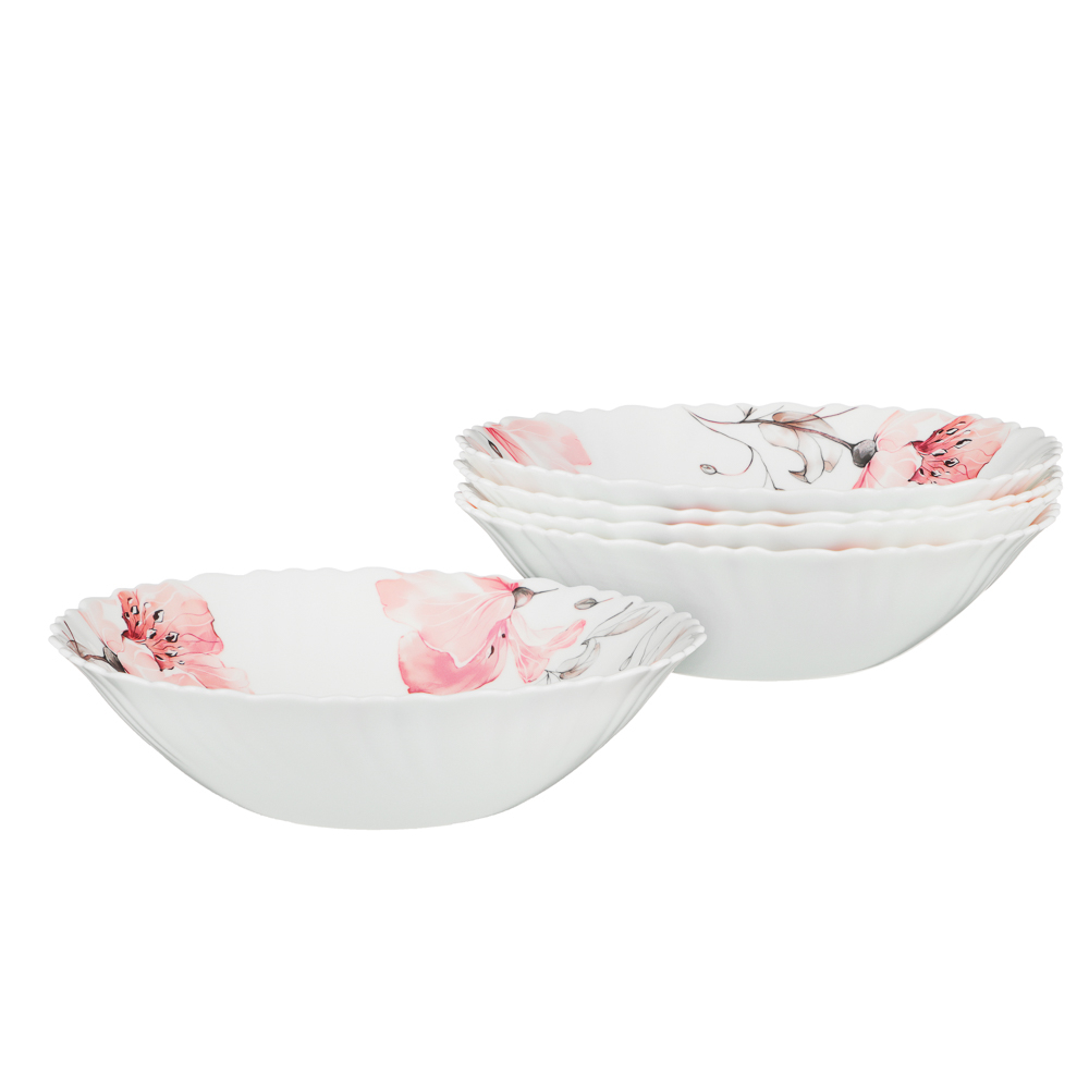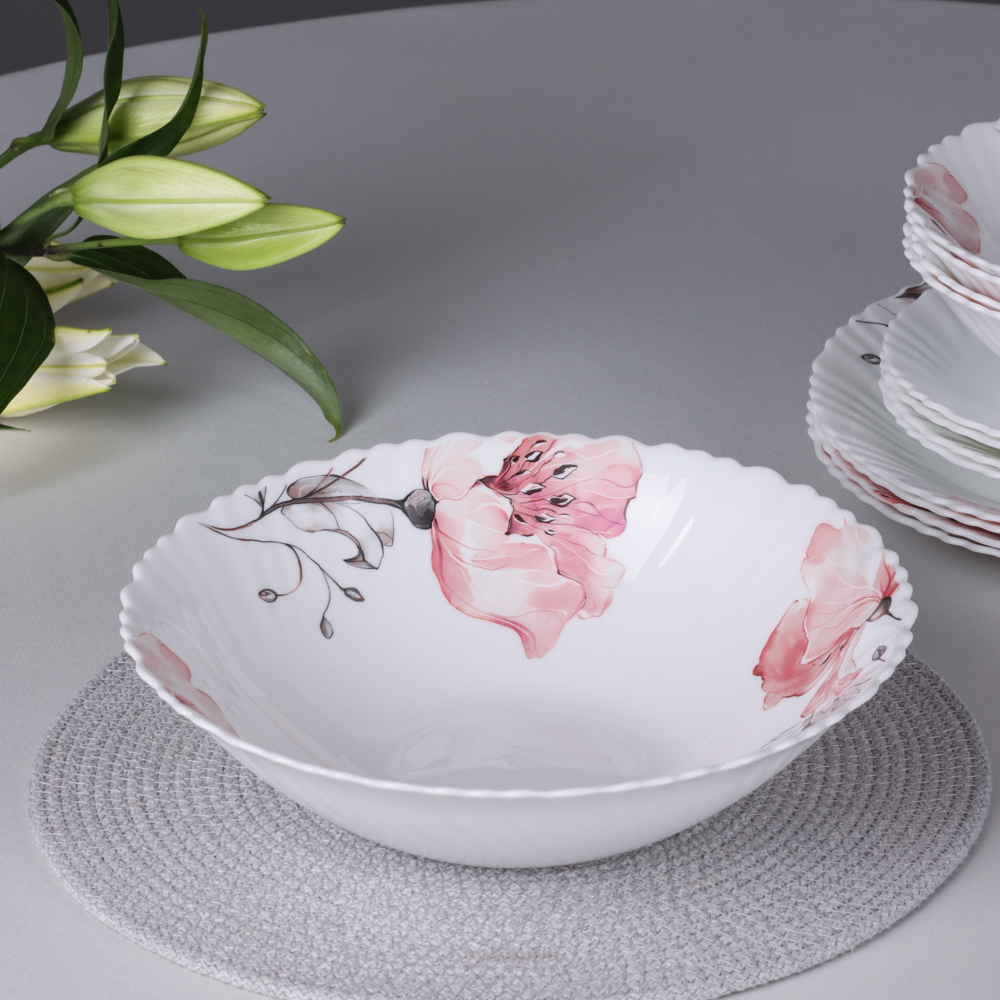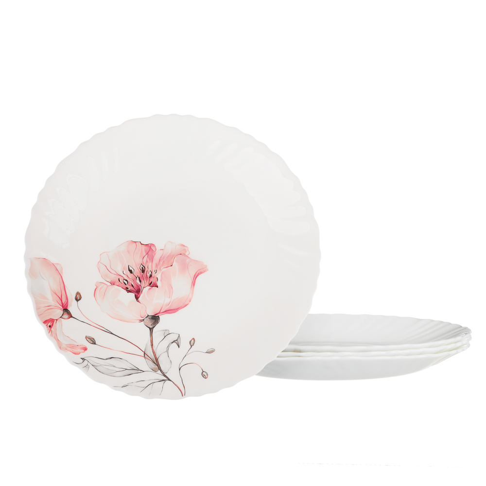 Нежный рисунок с розовыми цветами на белом фоне придает каждой тарелке особую утонченность, превращая обычную трапезу в праздник.