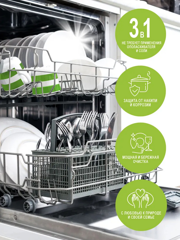 Экологичные таблетки для посудомоечных машин предназначены для качественного мытья посуды и столовых приборов в посудомоечных машинах любого типа.