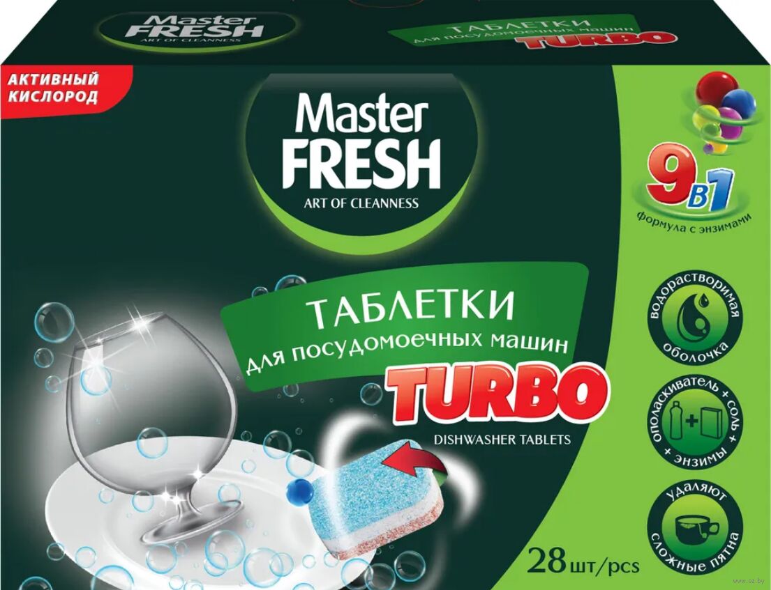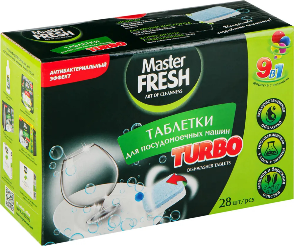 Таблетки для посудомоечной машины "MASTER FRESH Turbo 9в1" 3-х слойные растворимые бережно отмывают посуду, не оставляя царапин.