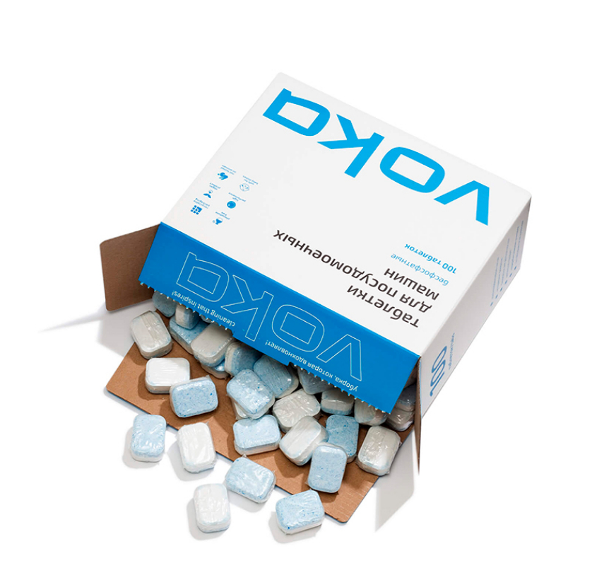 Voka не только очищает, но и бережно защищает: особый компонент – перкарбонат натрия – предотвращает образование налёта, продлевая срок службы посудомоечной машины таблетки покрыты плёнкой, которая полностью растворяется в воде во время мойки. Экологичная упаковка выполнена из картона и подлежит вторичной переработке.
