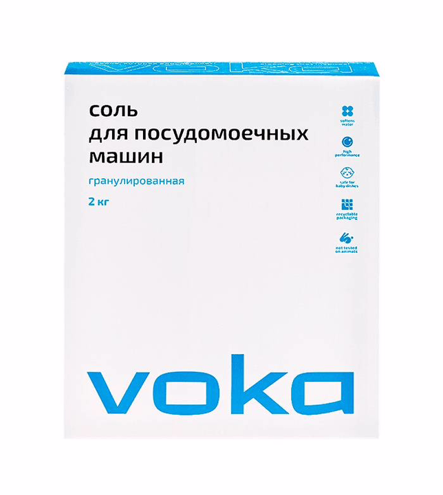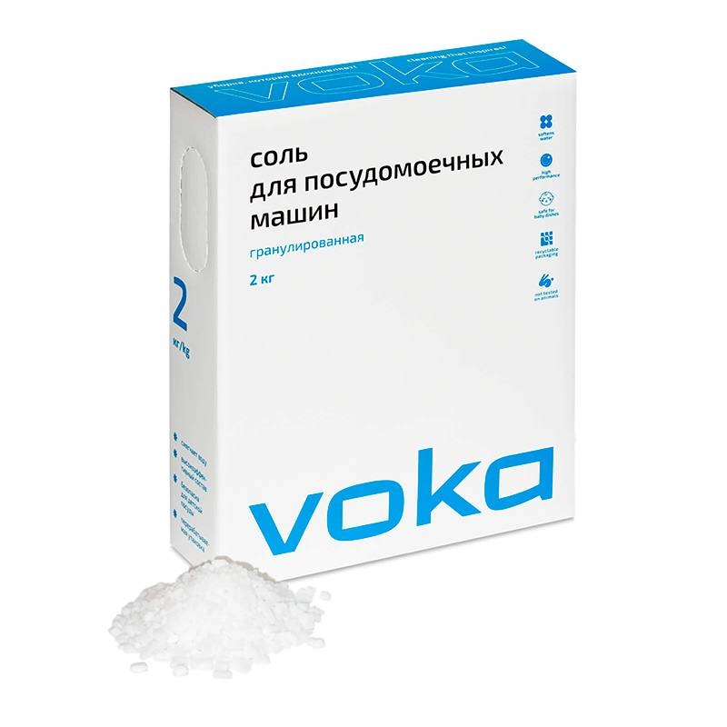Соль для посудомоечных машин Voka – соль высокой степени очистки, предотвращает образование накипи и известкового налета в посудомоечной машине, повышая ее производительность и продлевая срок службы.