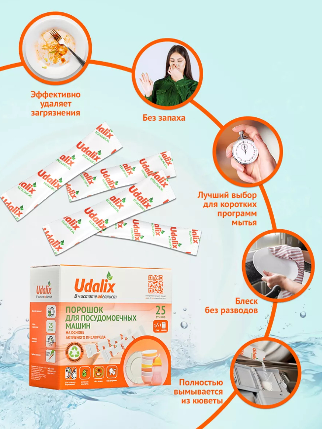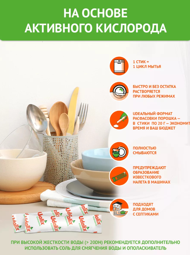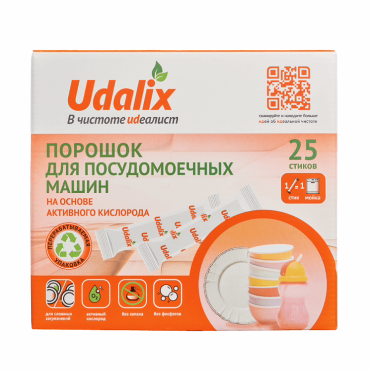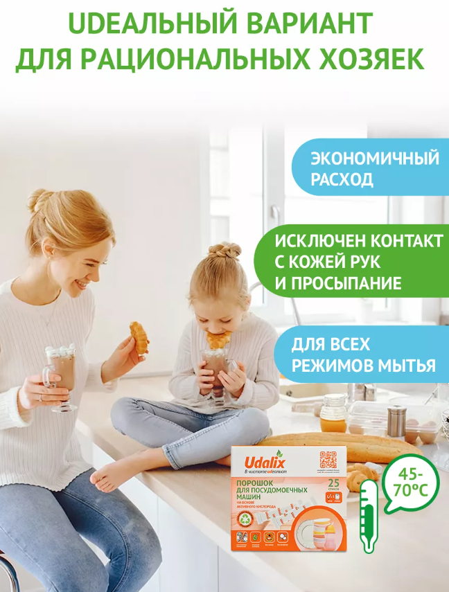 Бесфосфатные порошки Udalix для посудомоечной машины идеальный вариант для рациональных хозяек: порошок лучше всего подходит для сильно загрязненных, засохших и жирных столовых приборов, тарелок, сковород. Порошки Udalix для ПММ – лучший выбор для программ быстрой стирки.