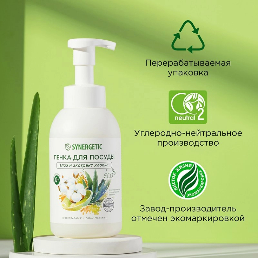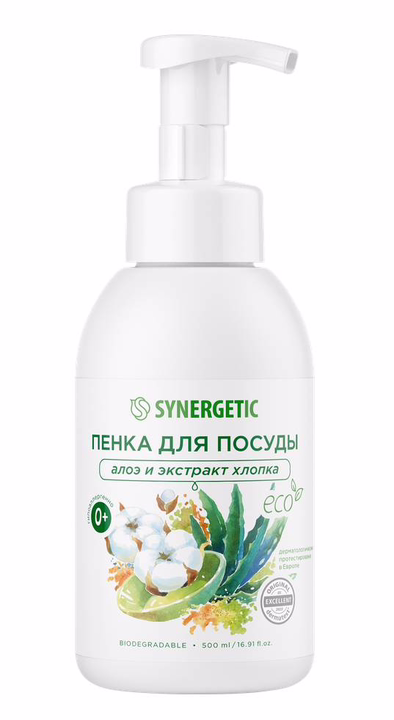 Биоразлагаемая гипоаллергенная пенка для мытья посуды, детской посуды и игрушек "Алоэ и экстракт хлопка" – это эффективное средство для мытья всех видов посуды (в том числе детской), кухонного инвентаря и детских игрушек.