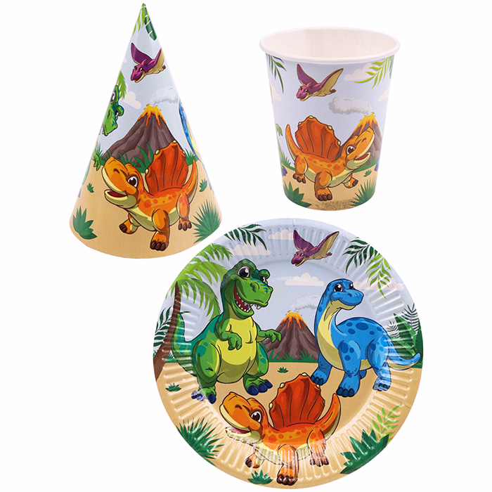 Набор включает в себя: 6 тарелок, 6 стаканов, 6 праздничных колпачков.