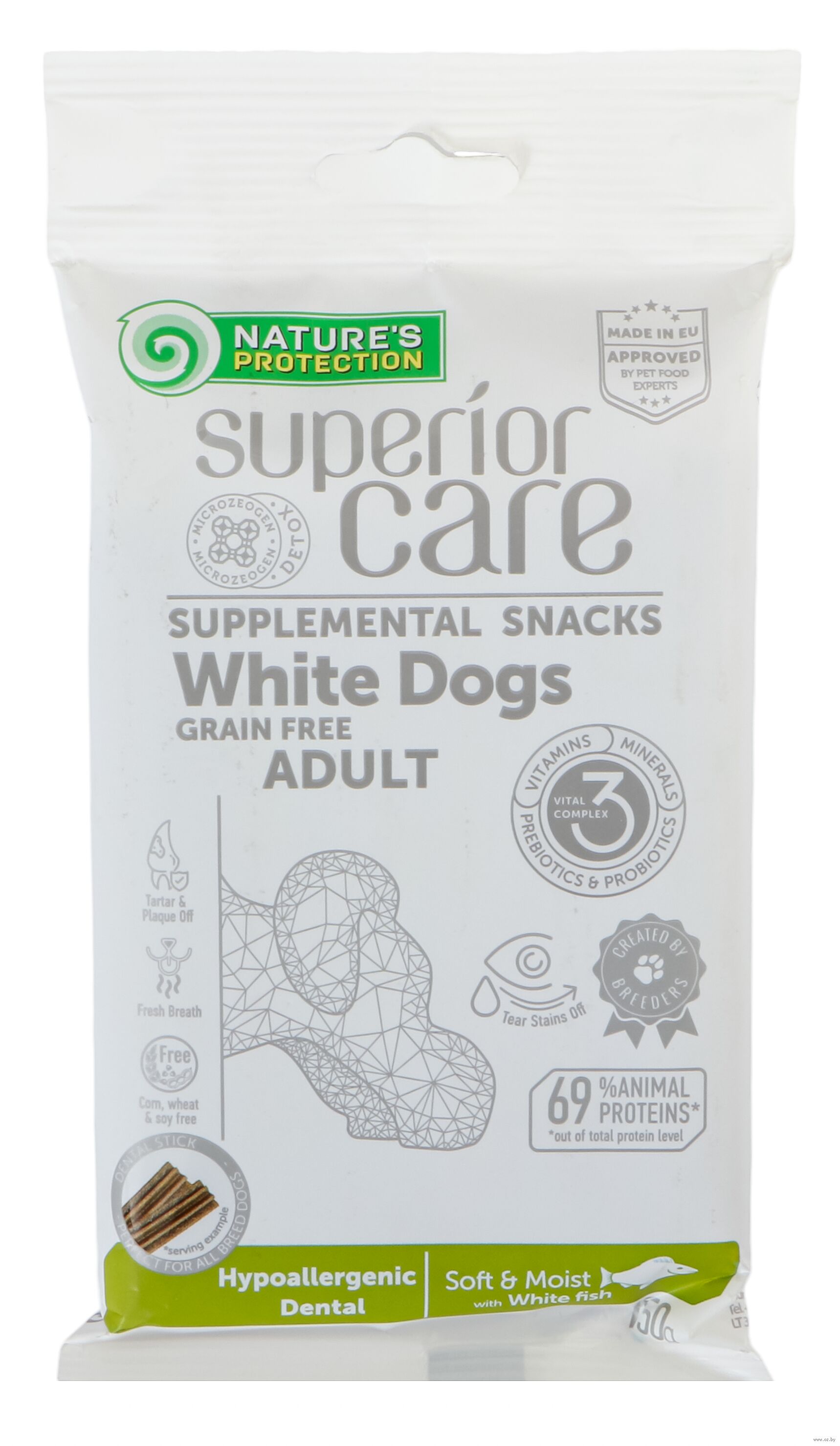 Кормовая добавка Nature's Protection "Superior Care White Dogs Grain Free Hypoallergenic Dental" – это кормовая добавка высочайшего качества, предназначенная для взрослых собак всех пород с белой или светлой шерстью идеально подходит для общего благополучия питомца и поддержания здоровья зубов. Это идеальный выбор, чтобы проявить любовь к вашей собаке и в то же время обеспечить ее ежедневной дозой необходимых витаминов, минералов, пребиотиков и пробиотиков (КомплексVital 3).