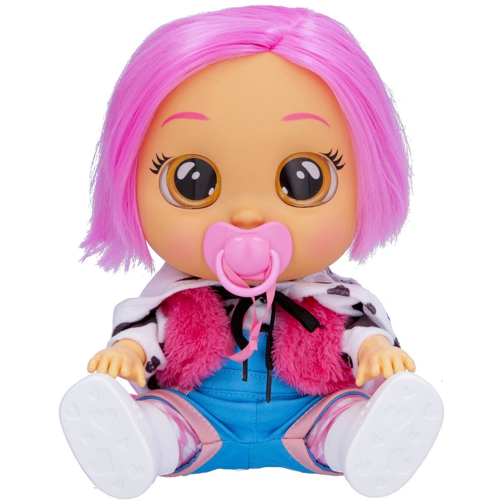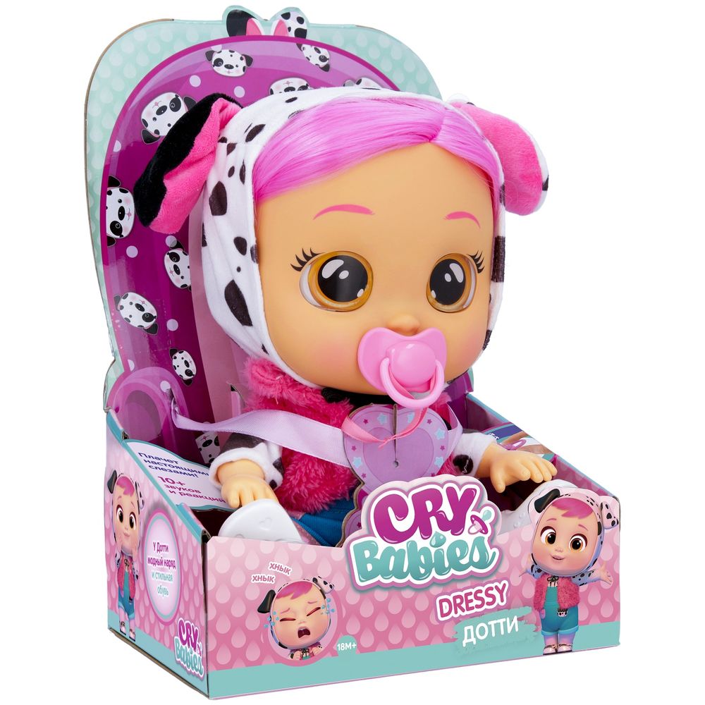 Модница Дотти нуждается в твоей заботе! Она обожает, когда с ней играют, одевают, а еще больше, когда обнимают. Но не стоит расстраивать обворожительную малышку! Она начнет грустно всхлипывать и плакать настоящими слезами, если ты заберешь у нее пустышку.
