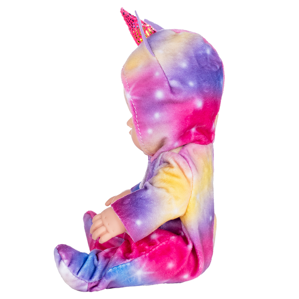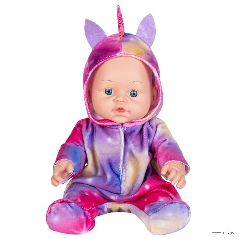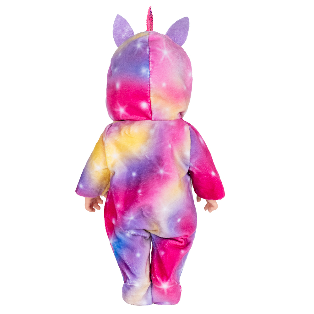 В набор к малышу входит радужный комбинезон, который застегивается на липучку. Используя аксессуары, девочка научится ухаживать за куклой, как если бы это был настоящий ребенок, а также нести ответственность за свое чадо.