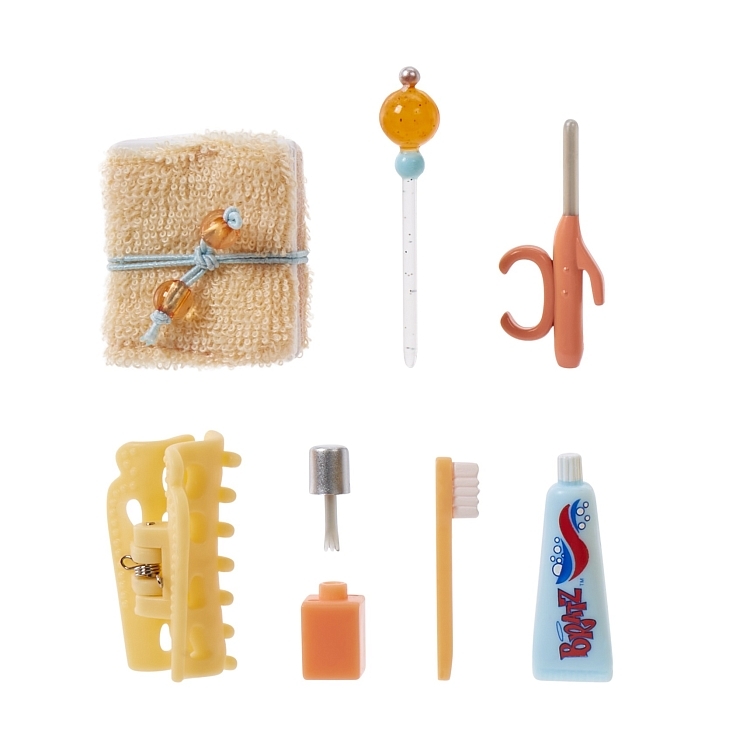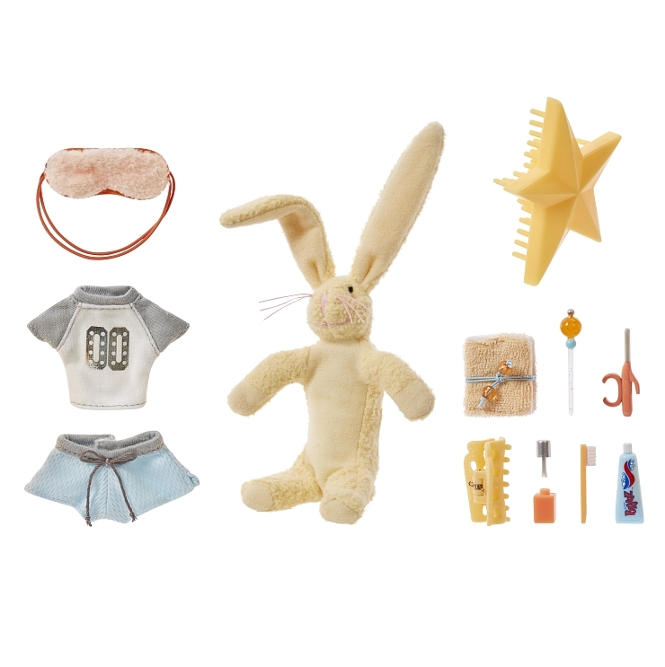 2 топа, пижамные штаны, шорты, халат, тапочки, игровые аксессуары для куклы: маска для сна, игрушка, дневник, ручка, лак для ногтей, краб для волос, утюжок, зубные паста и щетка, расческа и постер.