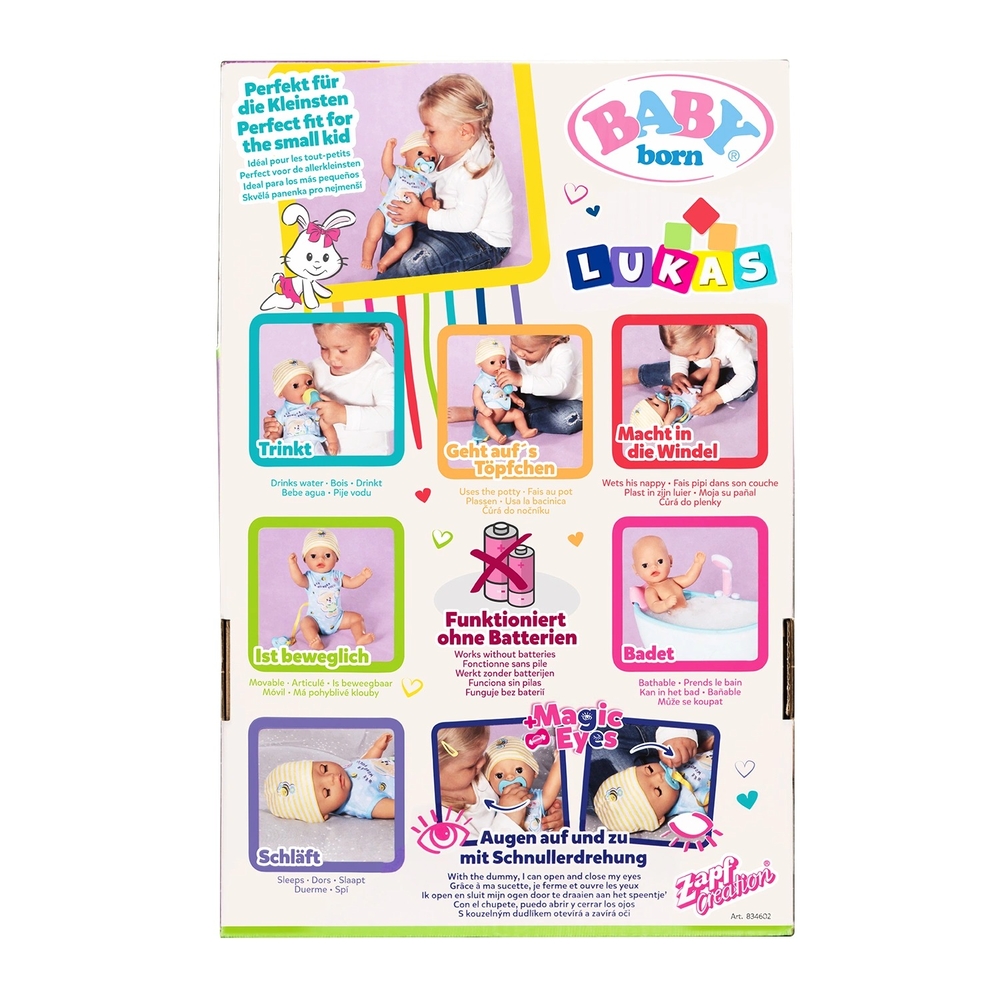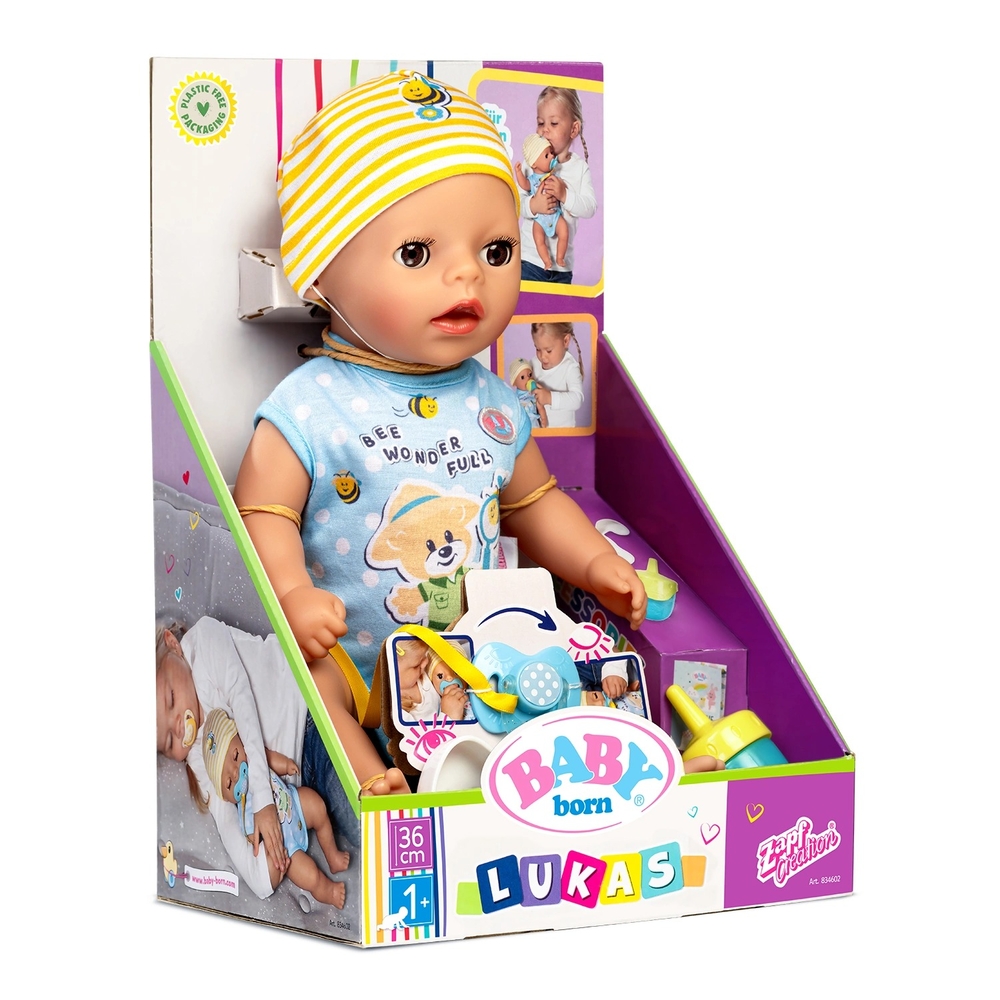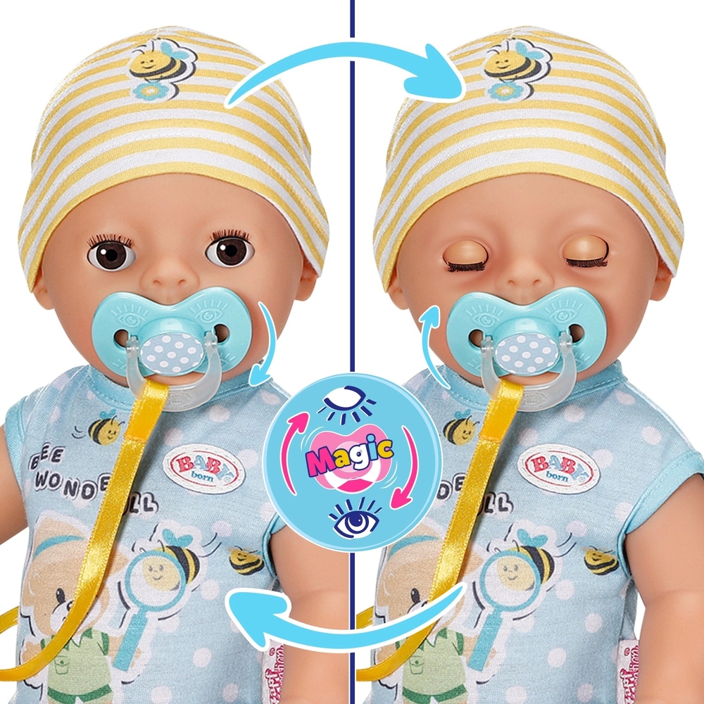 Познакомьтесь с куклой Беби Борн Лукас Магические глазки 36 см! На улице еще светло и Лукас никак не хочет спать? Просто поверни пустышку во рту, и глазки закроются, в каком бы положении ни находился малыш.