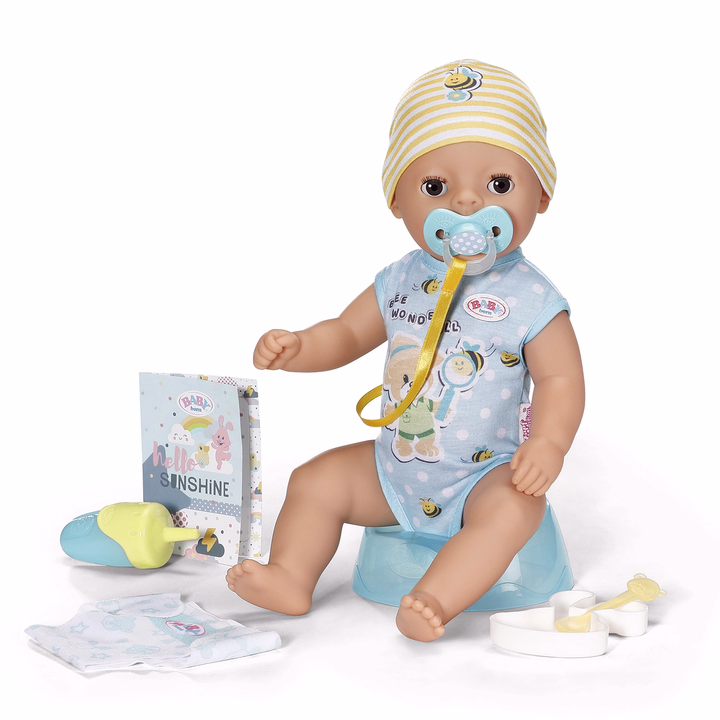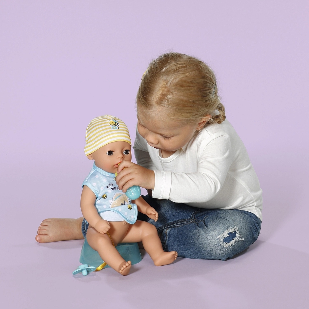 В комплекте 7 аксессуаров: свидетельство о рождении, бутылочка для питья, подгузник, соска, тарелка, ложка, горшок, инструкция. Кукла изготовлена из высококачественного материала, безопасного для детей.