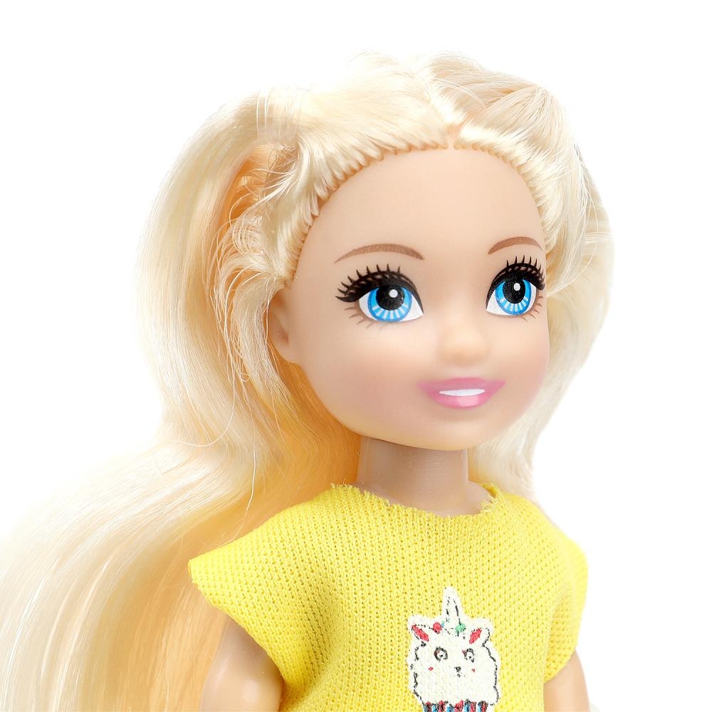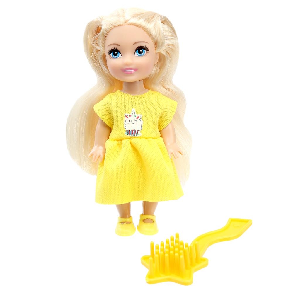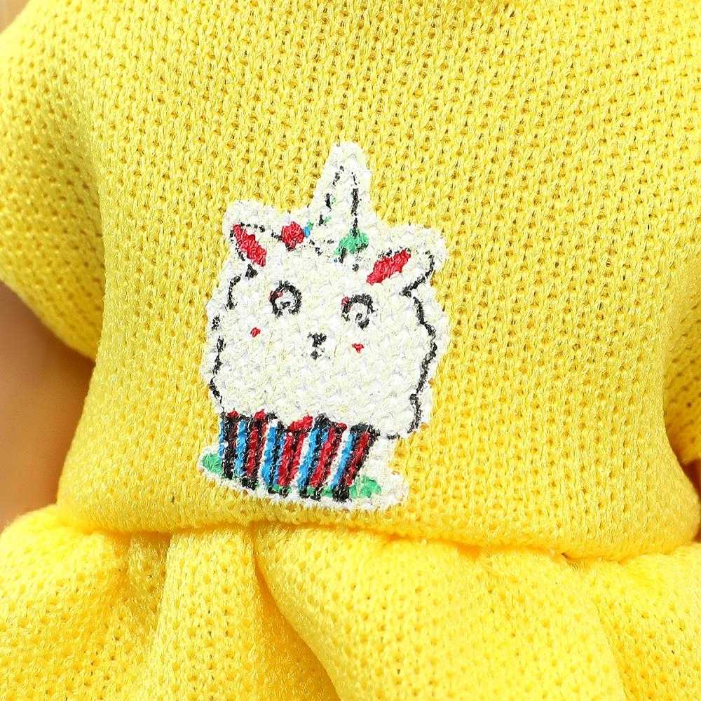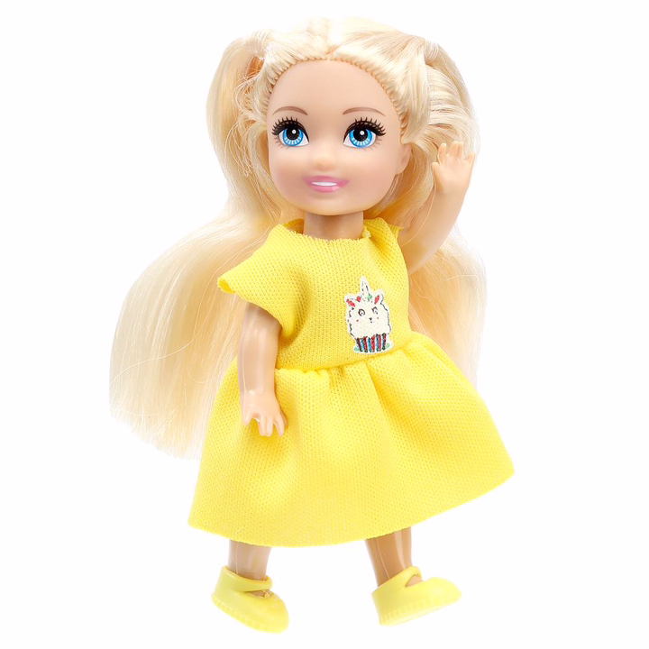 Очаровательная куколка Аня одета в милое жёлтое платьице с принтом.
