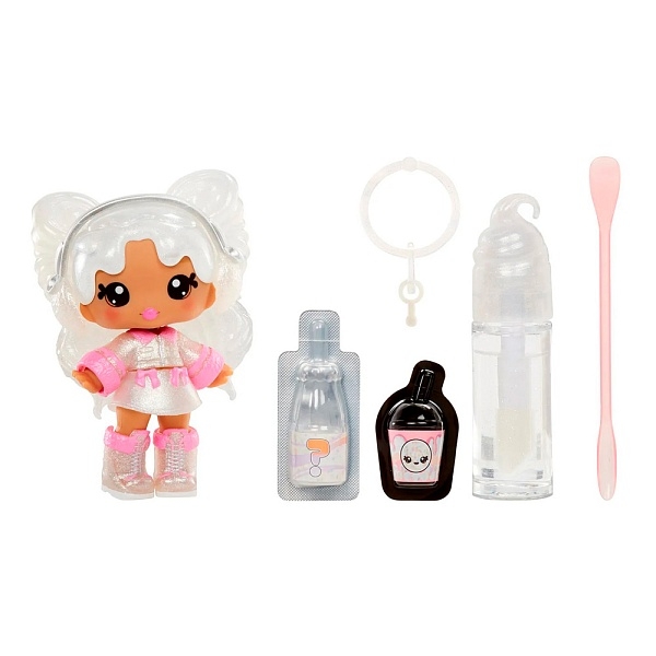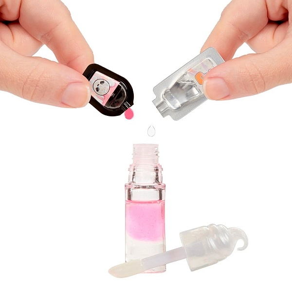 В наборе: кукла со съемным нарядом и обувью, компоненты для приготовления блеска для губ (база для блеска для губ, ароматизатор с ароматом "неаполитанское мороженое", краситель), кольцо для подвеса, ложечка для смешивания.