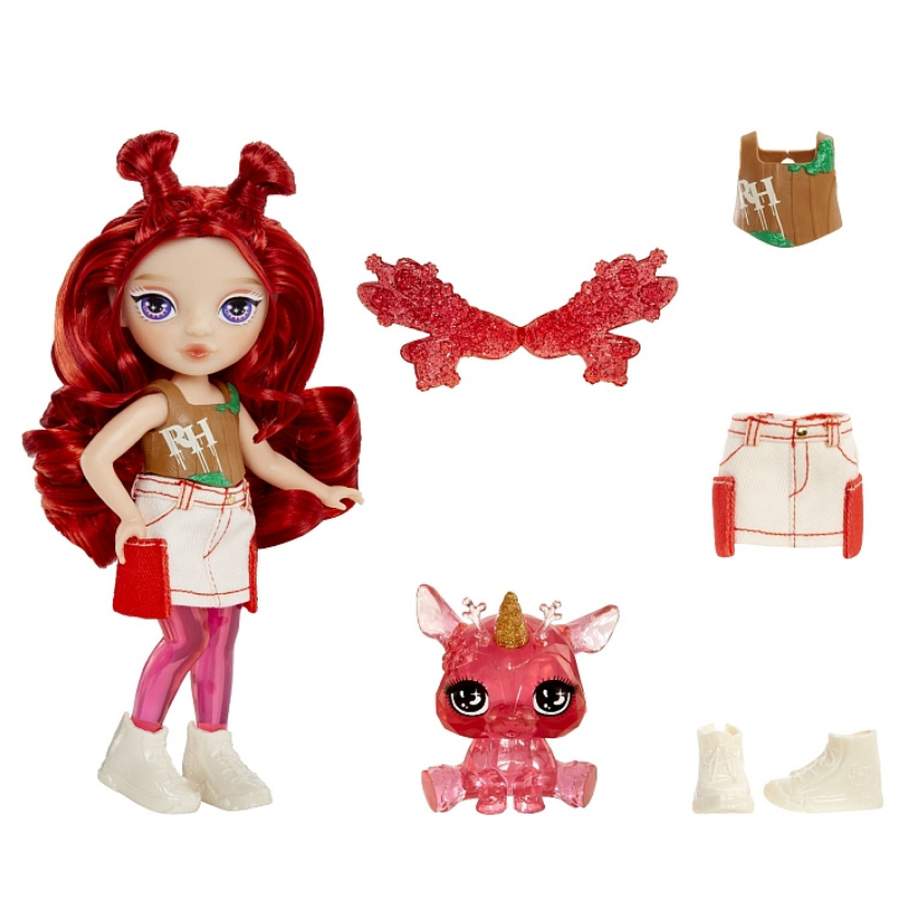В наборе: модная кукла, комплект одежды и обуви, питомец, и съемные крылья, которые подходят как к кукле, так и к питомцу.