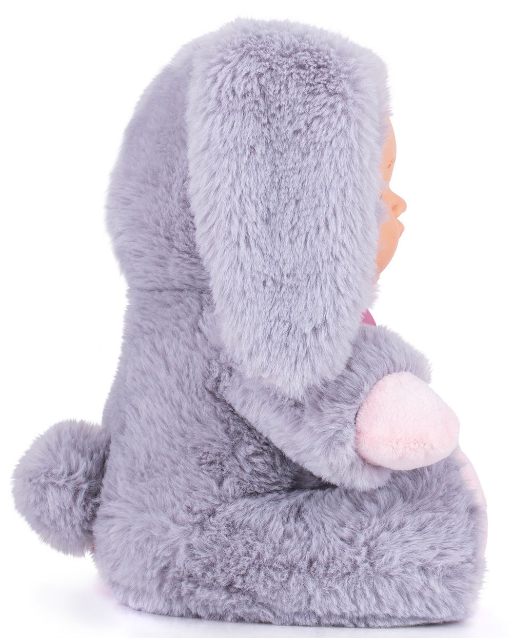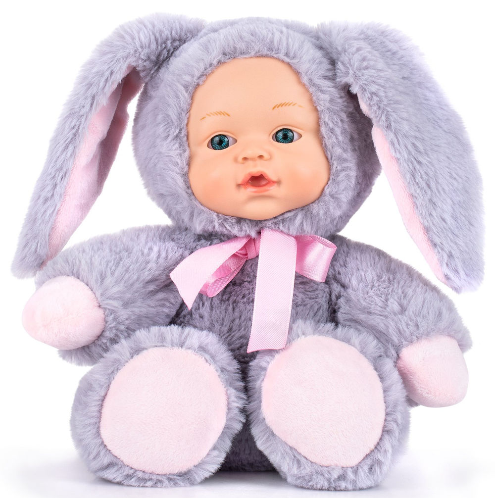 Пушистый и очень приятный на ощупь комбинезон в образе зайчика делает пупса еще более притягательным. Комбинезон не снимается.