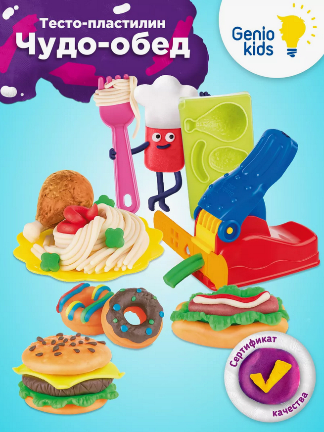 С детским набором для творчества Genio Kids "Чудо-обед" ваш ребенок попробует себя в роли повара на своей собственной кухне и приготовит своё фирменное блюдо: пасту, курочку, картофель, бургер, хот-дог или, может быть, пончик? Тесто – пластилин Genio Kids – это отличный способ развития творческих способностей малышей и увлекательное занятие для маленьких детей.