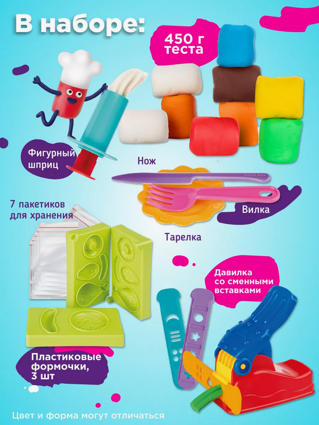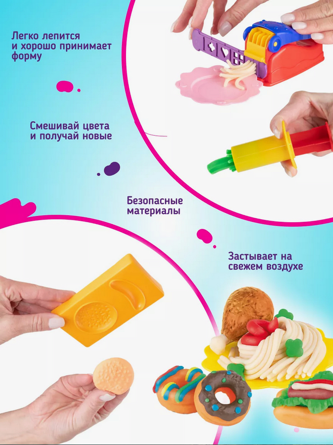 В наборе 8 кусочков теста-пластилина и МНОГО аксессуаров-помощников, с которыми обед точно удастся!
