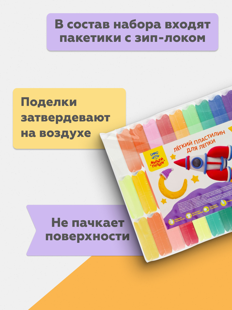 Пластилин полностью высыхает на воздухе и сохраняет форму поделки. Чтобы неиспользованный пластилин не высох в состав набора входят пакетики с зип-локом, в которые можно убирать неиспользованный пластилин.