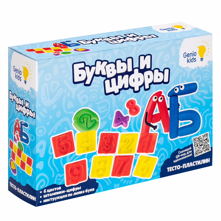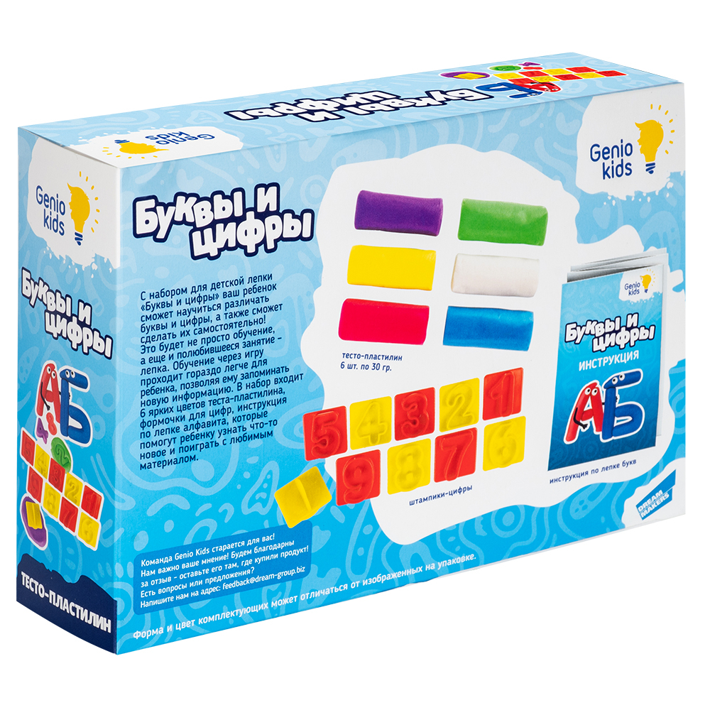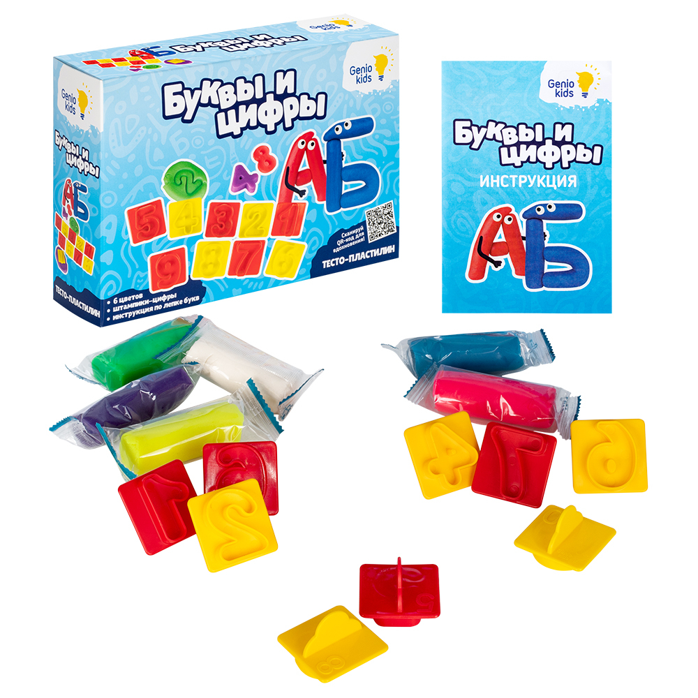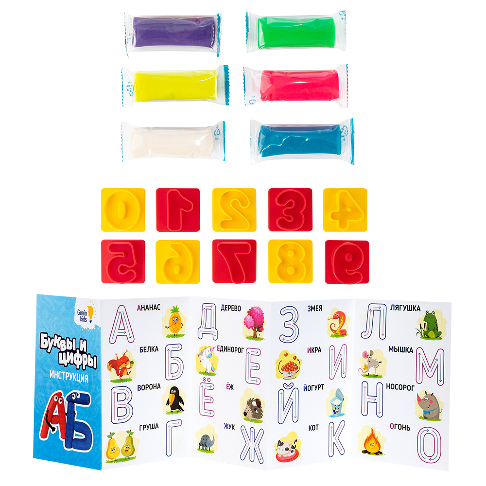 В набор входит 6 ярких цветов теста-пластилина, формочки для цифр, инструкция по лепке алфавита, которые помогут ребенку узнать что-то новое и поиграть с любимым материалом.