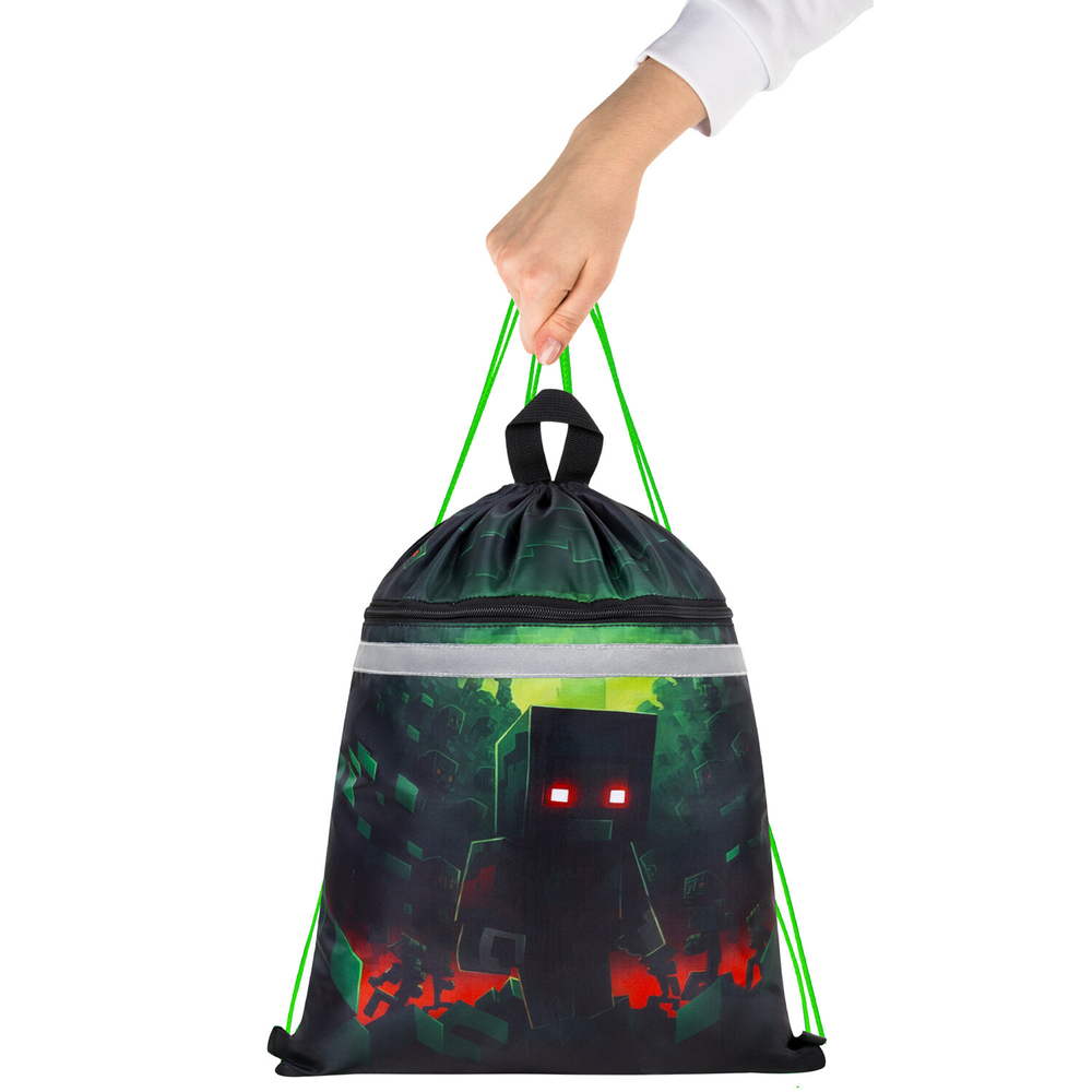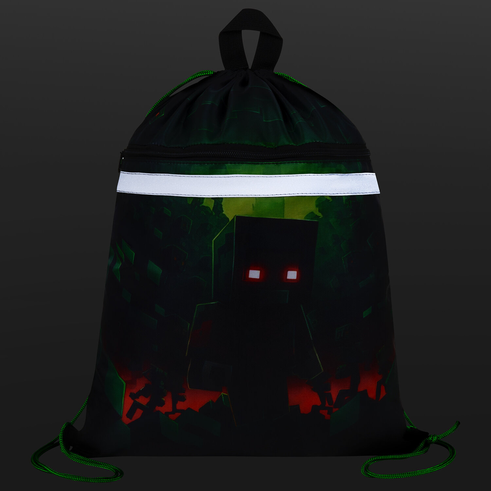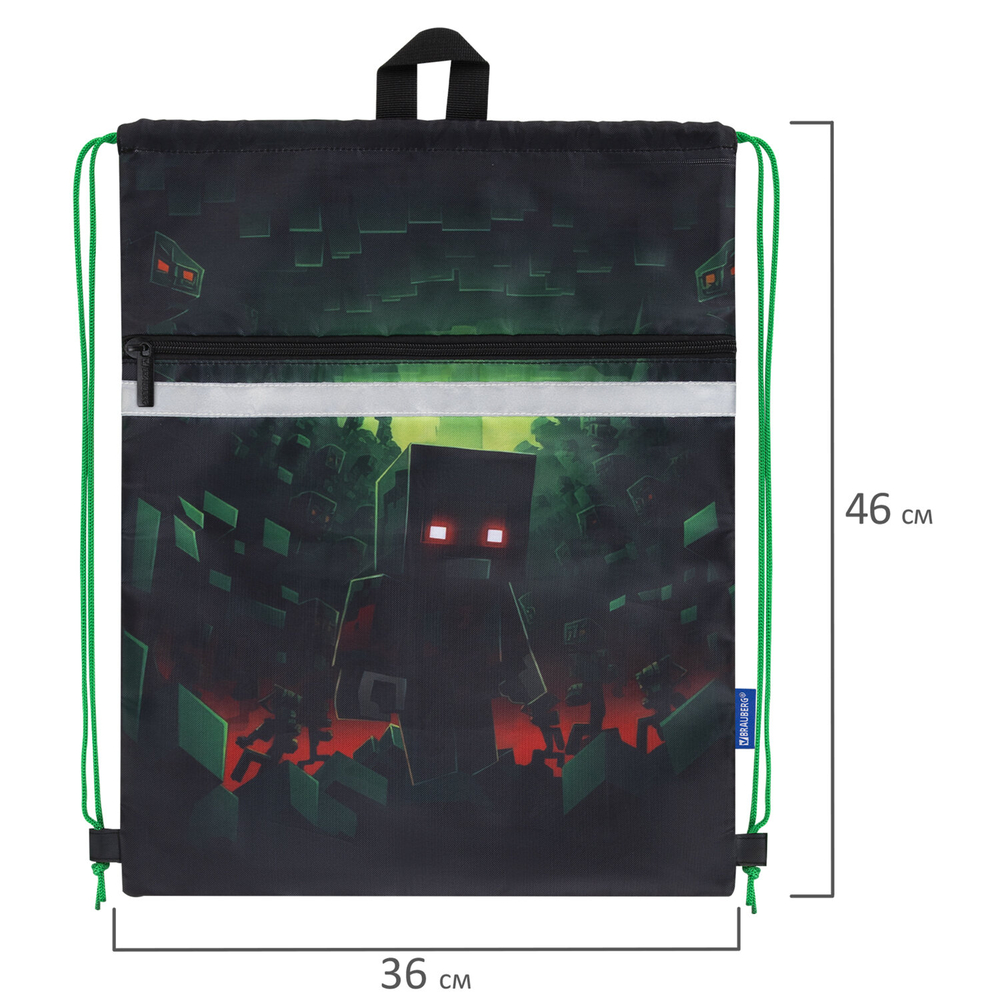Мешок для обуви изготовлен из плотного полиэстера с водоотталкивающей пропиткой. Одно вместительное отделение размером 46х36 см закрывается с помощью двойных шнурков-затяжек. Дополнительно сверху мешок оснащен петелькой для переноски в руке или для хранения на крючке под партой или в раздевалке. Для предотвращения загрязнения чистой сменной обуви или одежды мешок дополнен вторым изолированным отделением на молнии.