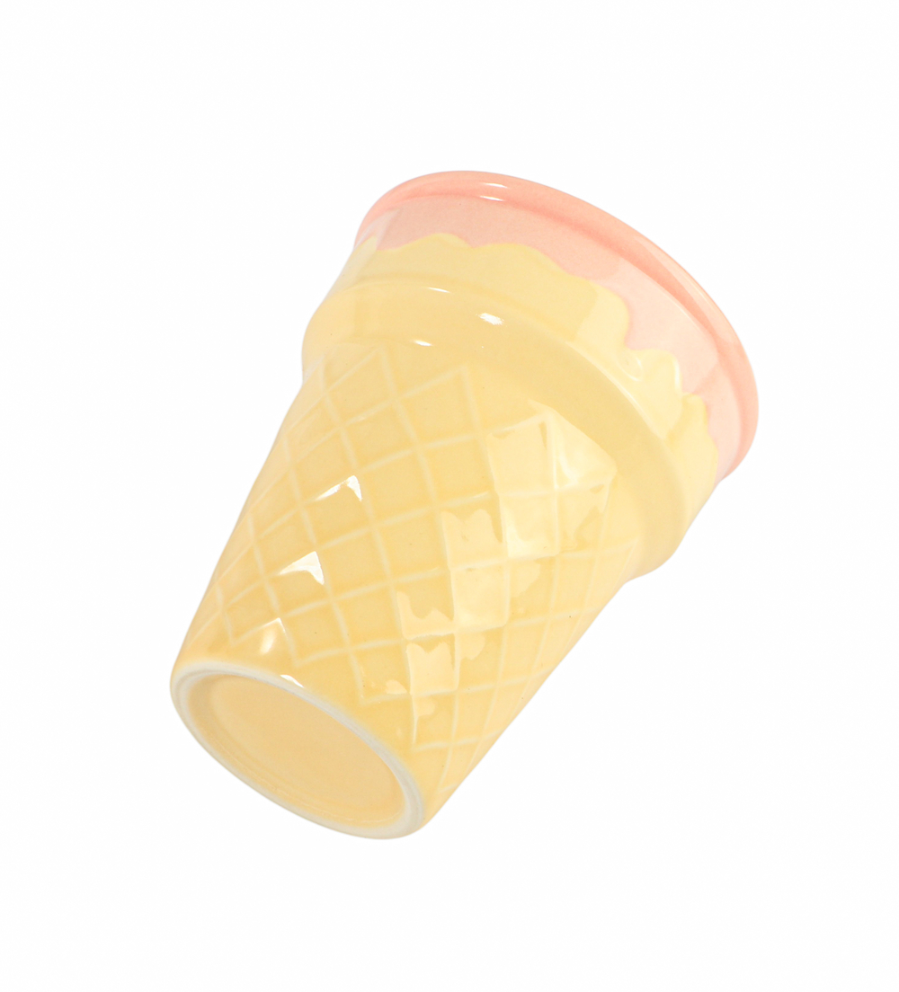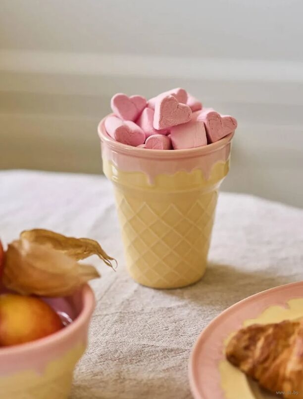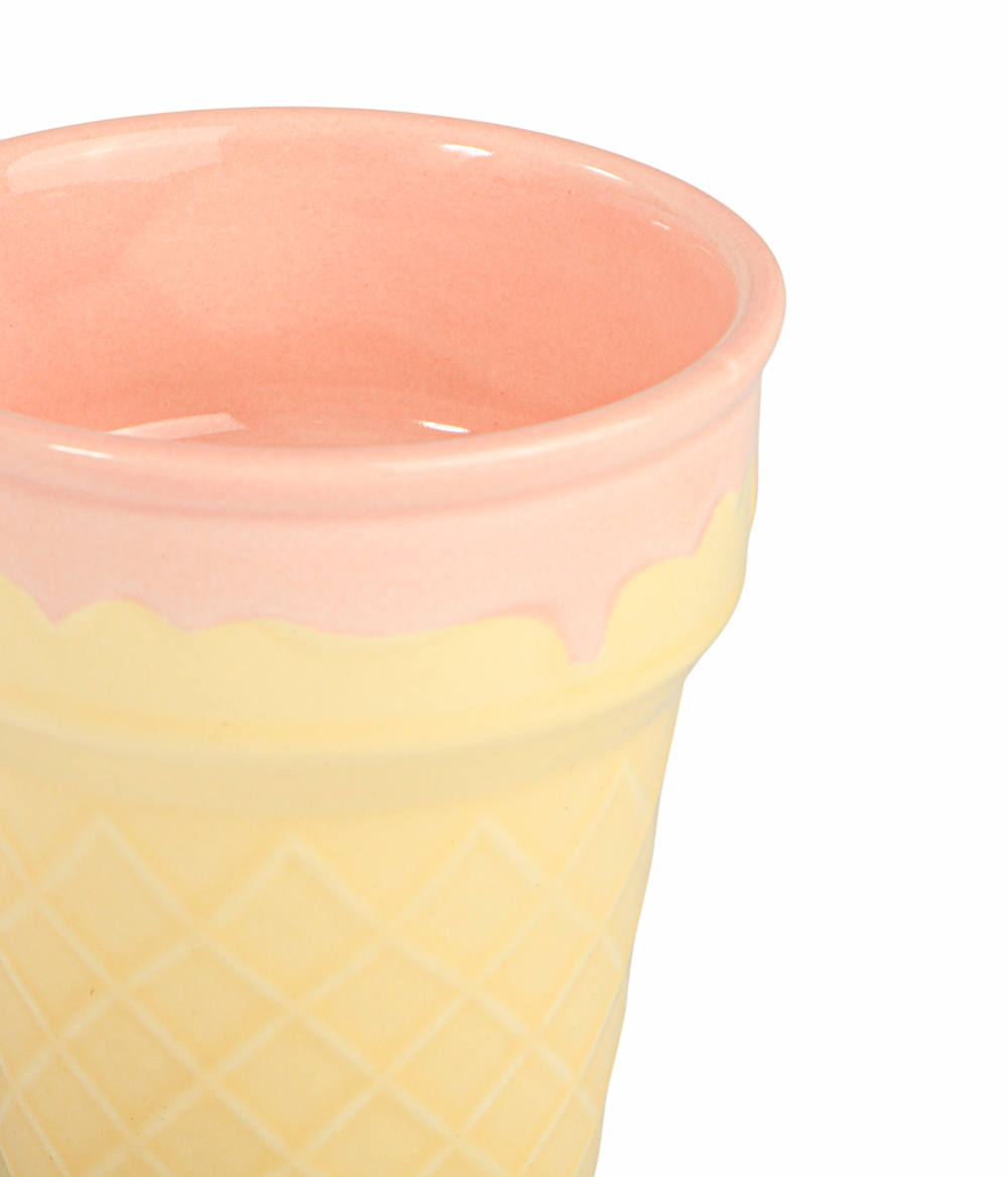 Этот очаровательный стакан – точная копия хрустящего вафельного стаканчика. Снаружи он полностью повторяет рельеф и фактуру настоящей вафли с характерными ромбиками, а внутри имеет гладкую керамическую поверхность.