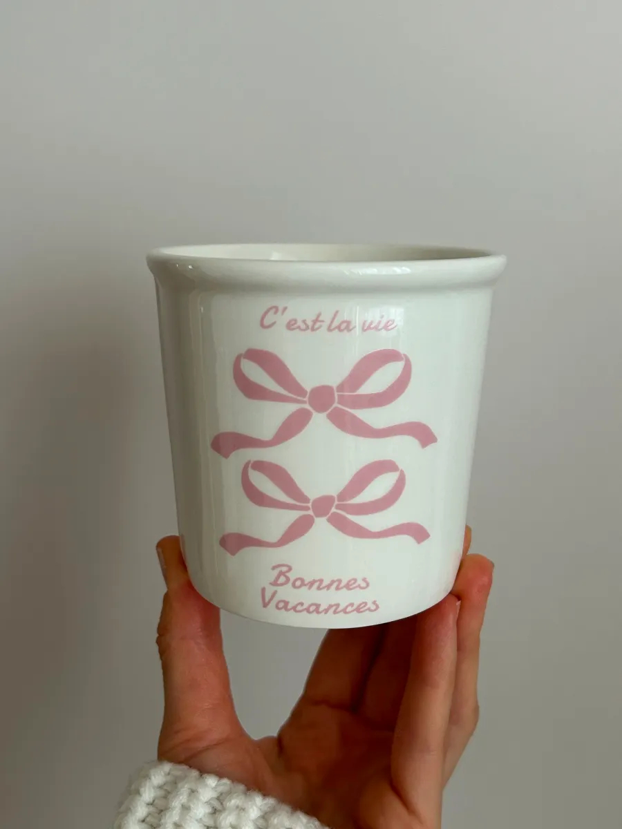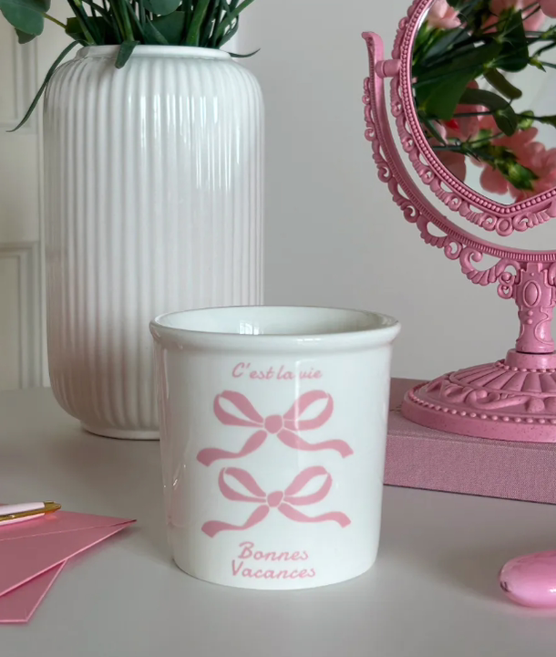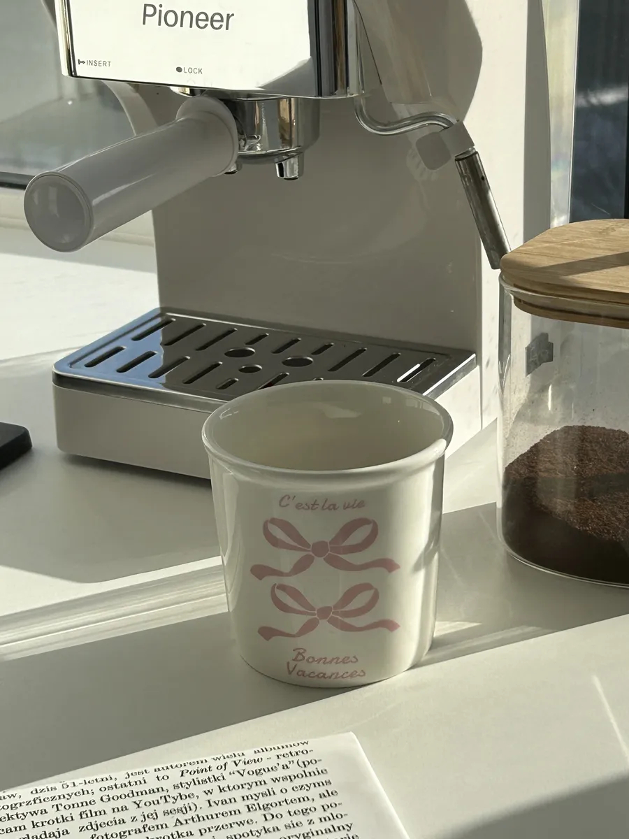 Стаканчик для кофе с розовыми бантиками станет не только украшением стола, но и подчеркнет Ваш вкус и подойдет для эстетичных фотографий.