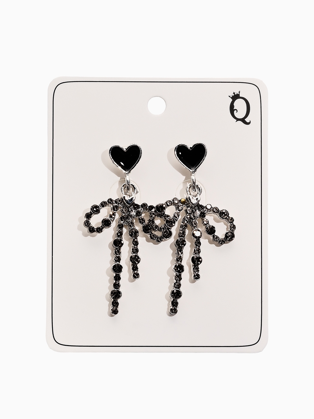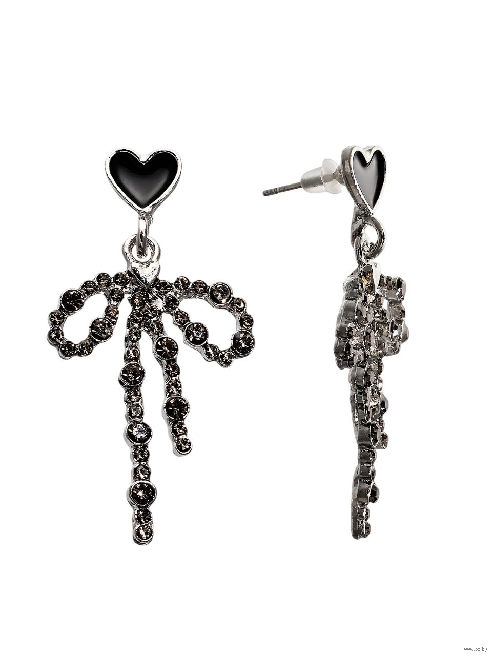 Центральные элементы представлены парой маленьких бантов, созданных из металлического основания с инкрустацией изящных черных стразов. Контраст серебристого корпуса и черного блеска производит сильное впечатление, превращая скромный аксессуар в настоящий центр внимания. Завершающим аккордом являются мелкие сердечки внизу, также декорированные черно-серебристыми камнями, усиливая общий романтический настрой.