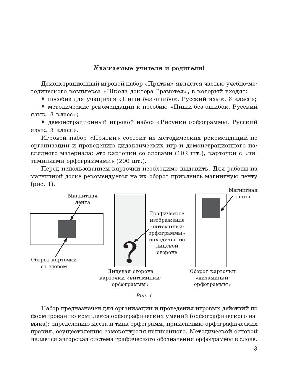 Набор предназначен для организации и проведения игровых действий по формированию комплекса орфографических умений: определение места и типа орфограмм, применение орфографических правил, осуществление самоконтроля написанного. Рекомендуется использовать на уроках, стимулирующих и поддерживающих занятиях, а также в индивидуальной работе с учащимися.