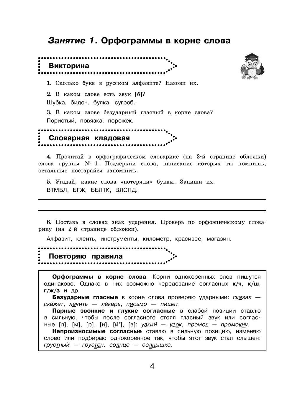 Примеры и задания книги помогут ребёнку повторить основные правила русского языка за 3 класс, вспомнить правописание и произношение словарных слов, навыки работы со словарями, выполнить разные виды письменных работ.