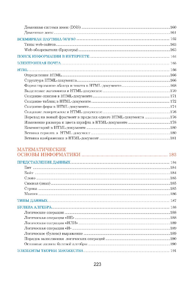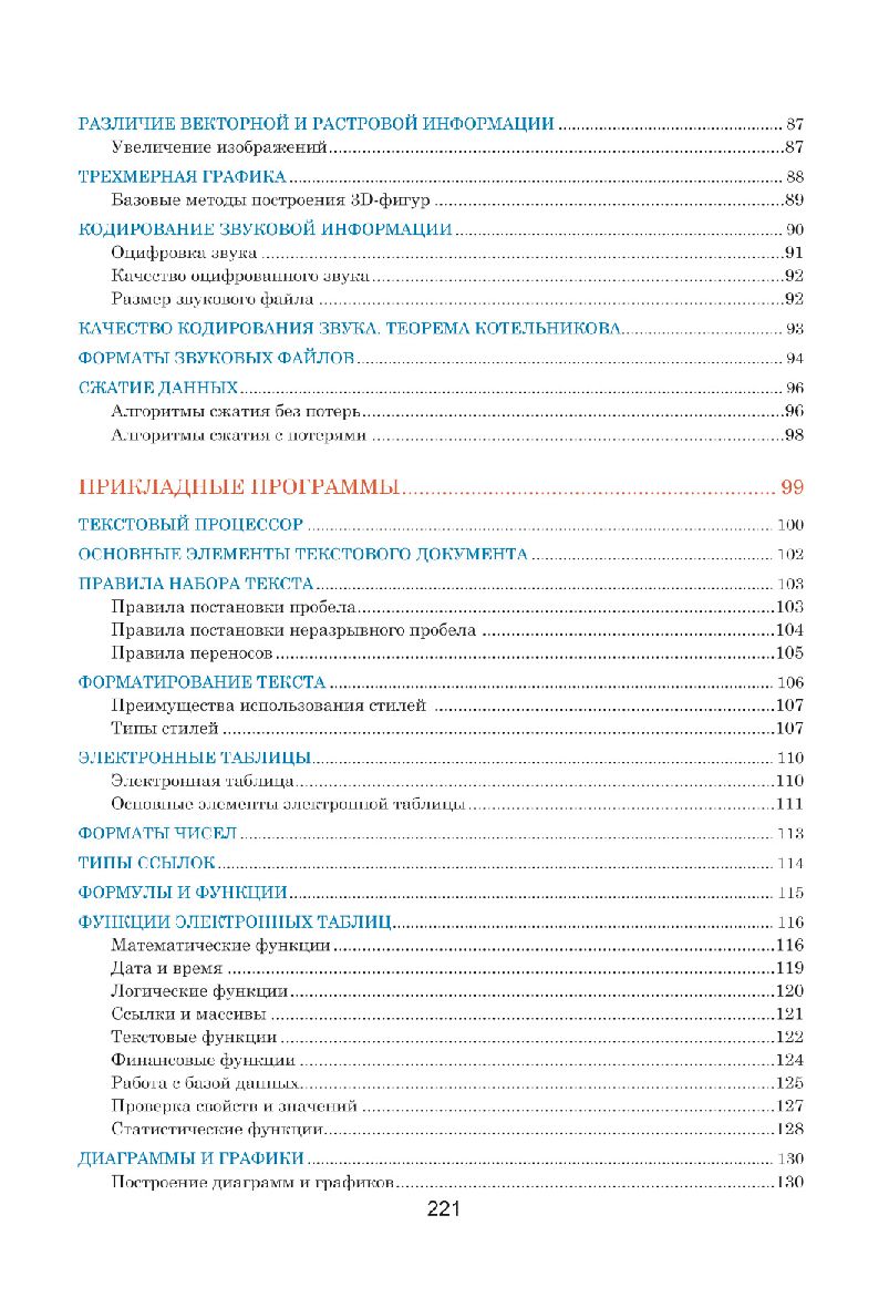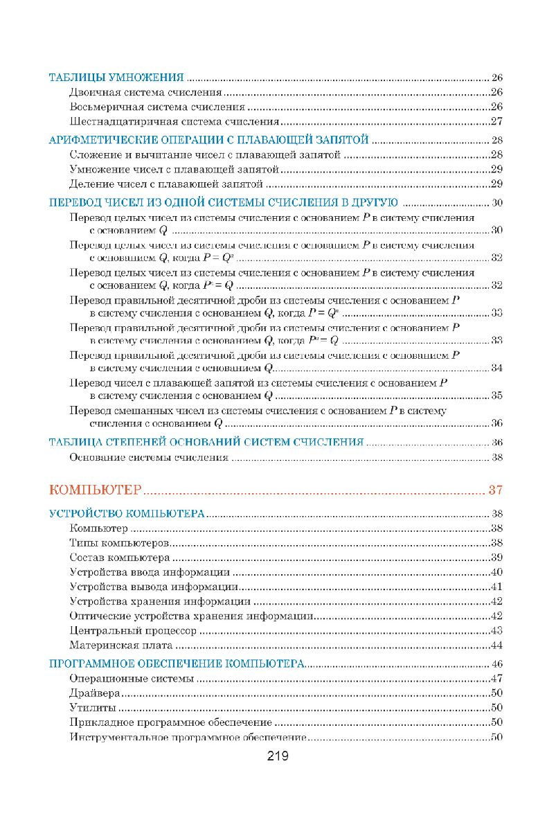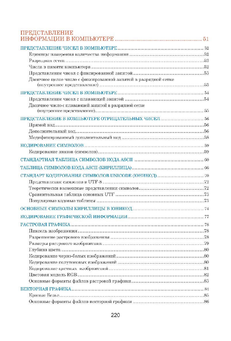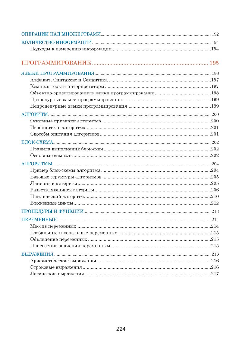 Данное пособие составлено в виде полноцветных таблиц, систематизирующих и обобщающих теоретические сведения по школьному курсу информатики. Подробно раскрыты основные темы: информация, системы счисления, основы математической логики, компьютер и его составляющие, основы программирования, технологии обработки текста и графики, компьютерные сети, безопасность и др. Теоретический материал подкреплен наглядными примерами, схемами и иллюстрациями.
