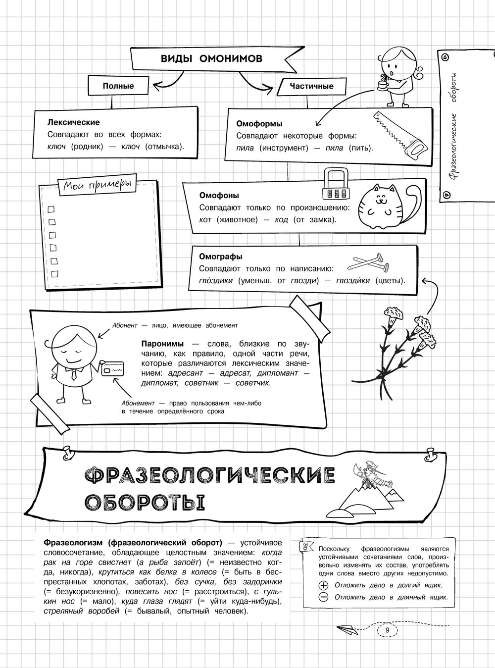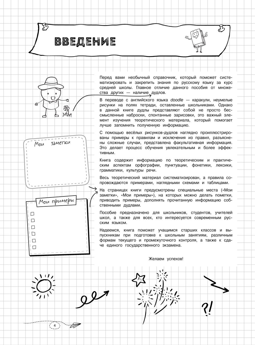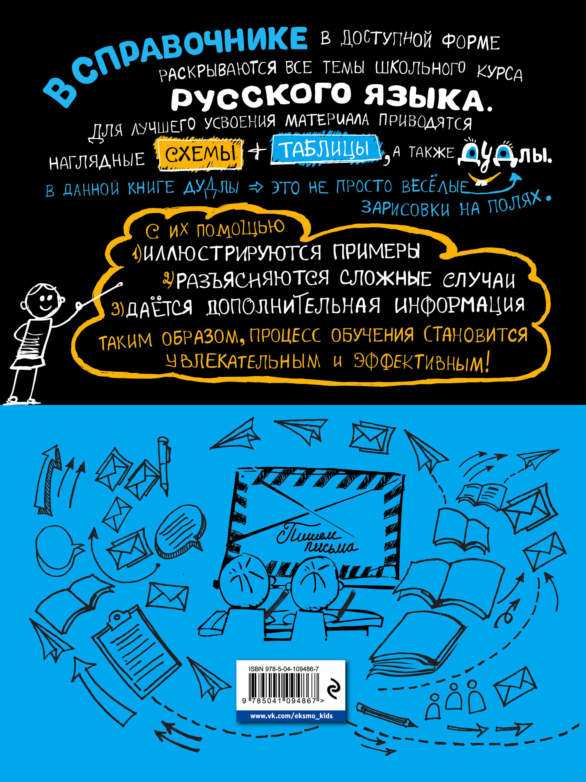 Справочник содержит сведения по всем темам школьного курса русского языка. Весь теоретический материал систематизирован, сопровождается примерами, наглядными схемами и таблицами, а также рисунками на полях (дудлами), которые помогают лучше запомнить полученную информацию. Пособие предназначено для школьников и учителей, а также для всех, кто интересуется вопросами русского языка.
