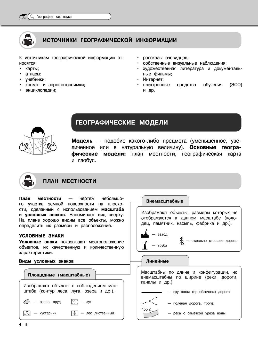 В пособии в наглядной и доступной форме приводятся сведения за весь школьный курс географии, информативные таблицы, карты, схемы и иллюстрации. Издание окажет помощь старшеклассникам при подготовке к урокам, различным формам текущего и промежуточного контроля, а также к экзаменам. Эта серия книг неспроста полюбилась многим учащимся и учителям. В книгах представлена действительно нужная и систематизированная информация, материал изложен последовательно, от простого к сложному, дополняется иллюстрациями, примерами, наглядными схемами и таблицами. В справочниках охватываются все темы школьного курса по основным предметам. С их помощью ученики 5-8 классов будут лучше усваивать даже самый сложный учебный материал, готовиться к урокам, а старшеклассники смогут систематизировать свои знания перед контрольными.