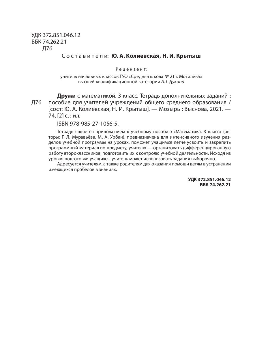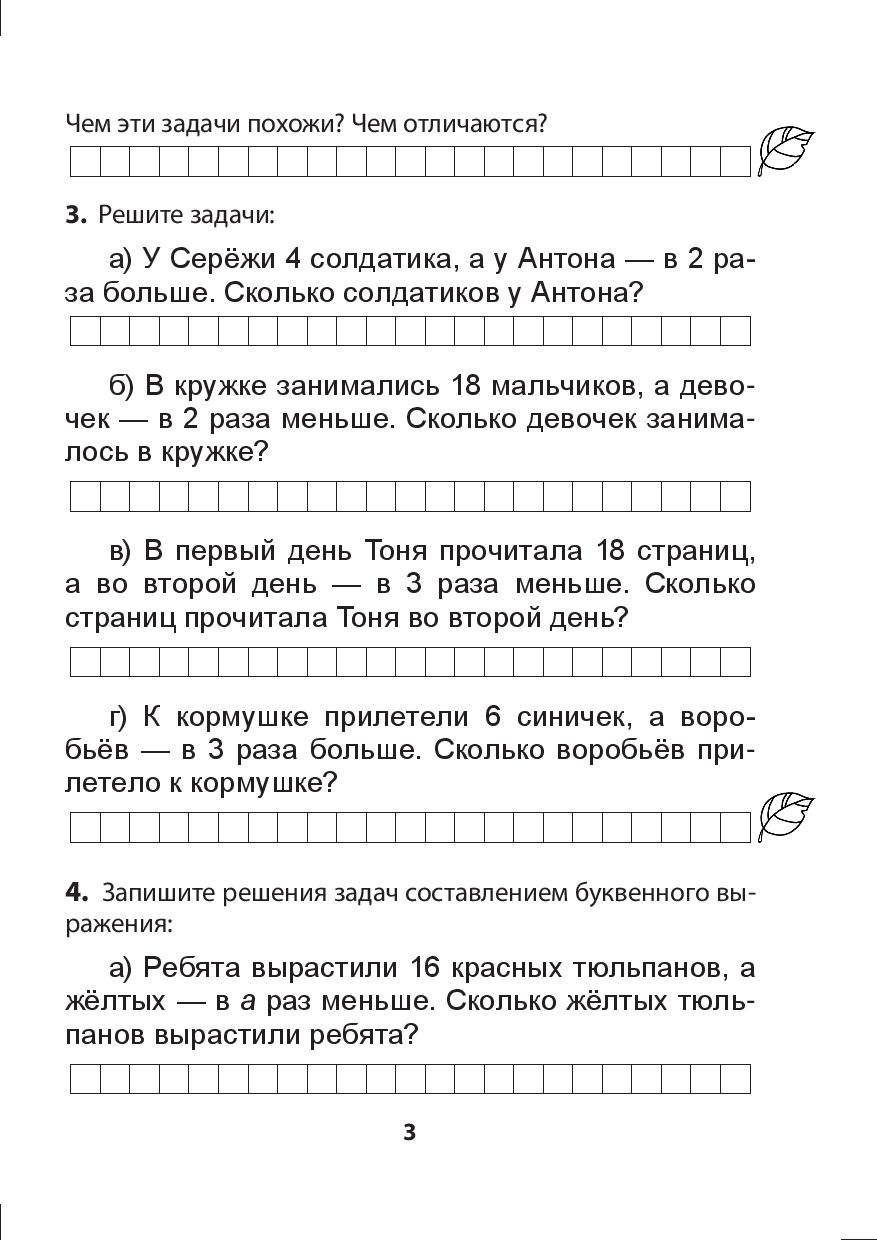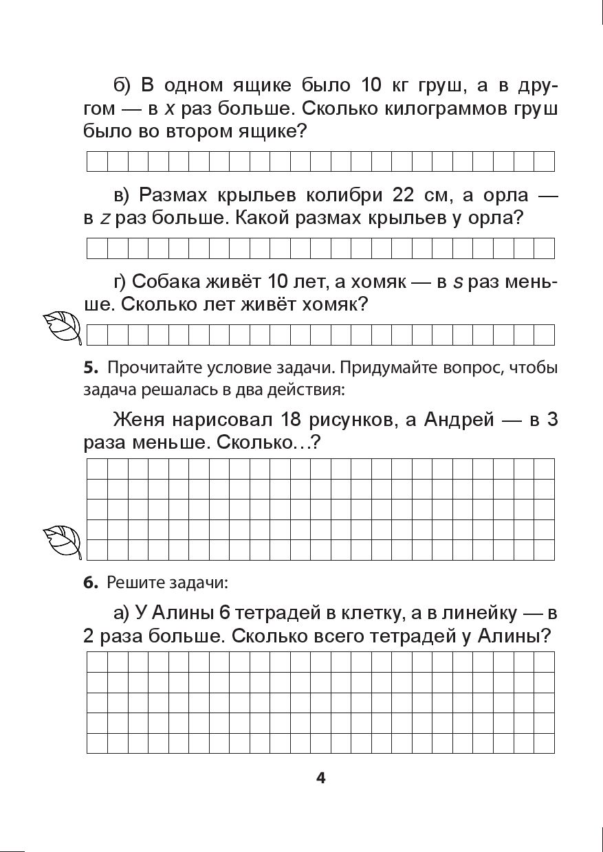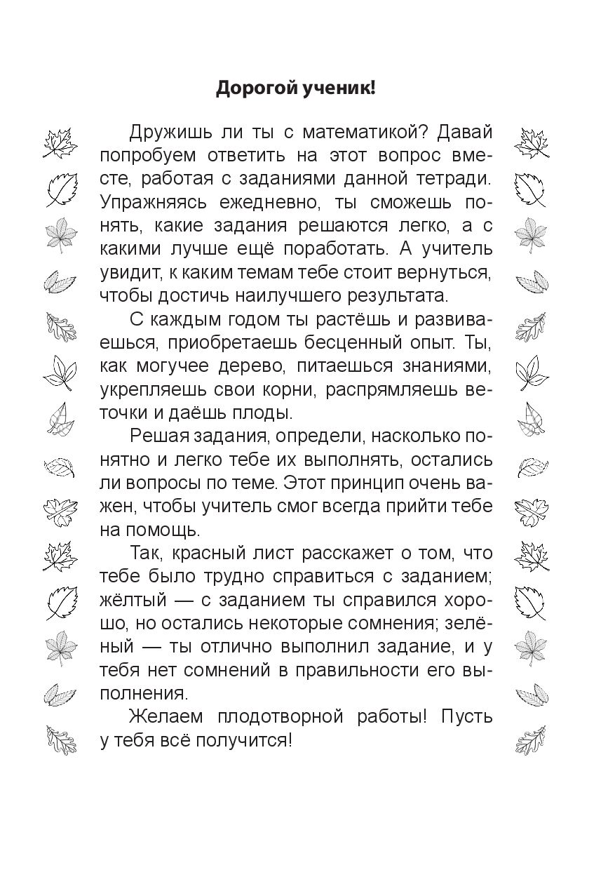 Тетрадь содержит дополнительные задания к урокам математики. Она предназначена для интенсивного изучения разделов учебной программы на уроках, поможет учащимся легче усвоить и закрепить программный материал по предмету, учителю – организовать дифференцированную работу, подготовить их к контролю учебной деятельности. Представленные в пособии задания будут способствовать повышению интереса к изучению математики и более глубокому усвоению знаний.