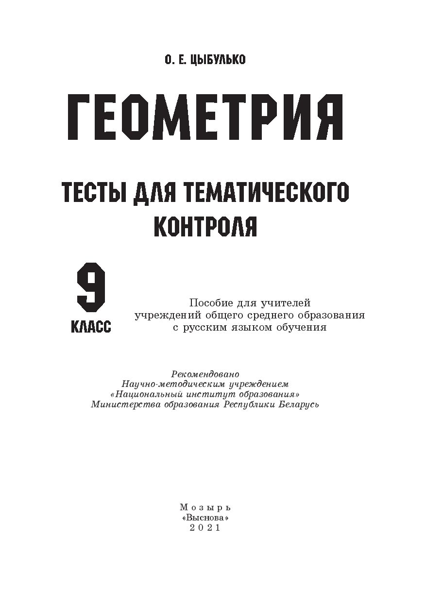 Пособие содержит тесты, которые позволят провести контроль знаний, умений и навыков учащихся по геометрии в 9 классе. Материал призван повысить эффективность проведения учебного процесса с учетом индивидуальных возможностей учащихся, так как предложенные задания носят разноуровневый характер. Тесты представлены в двух вариантах по каждой теме.
