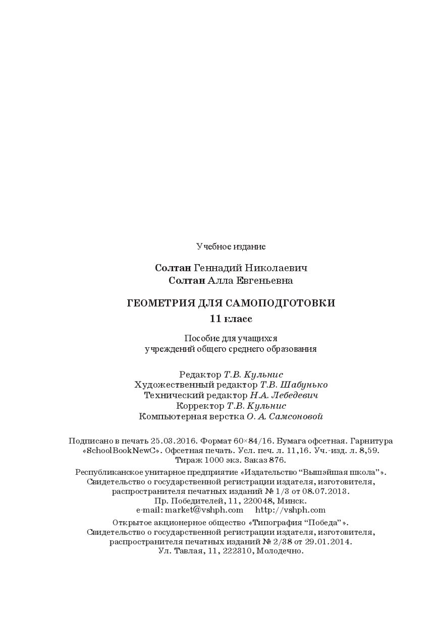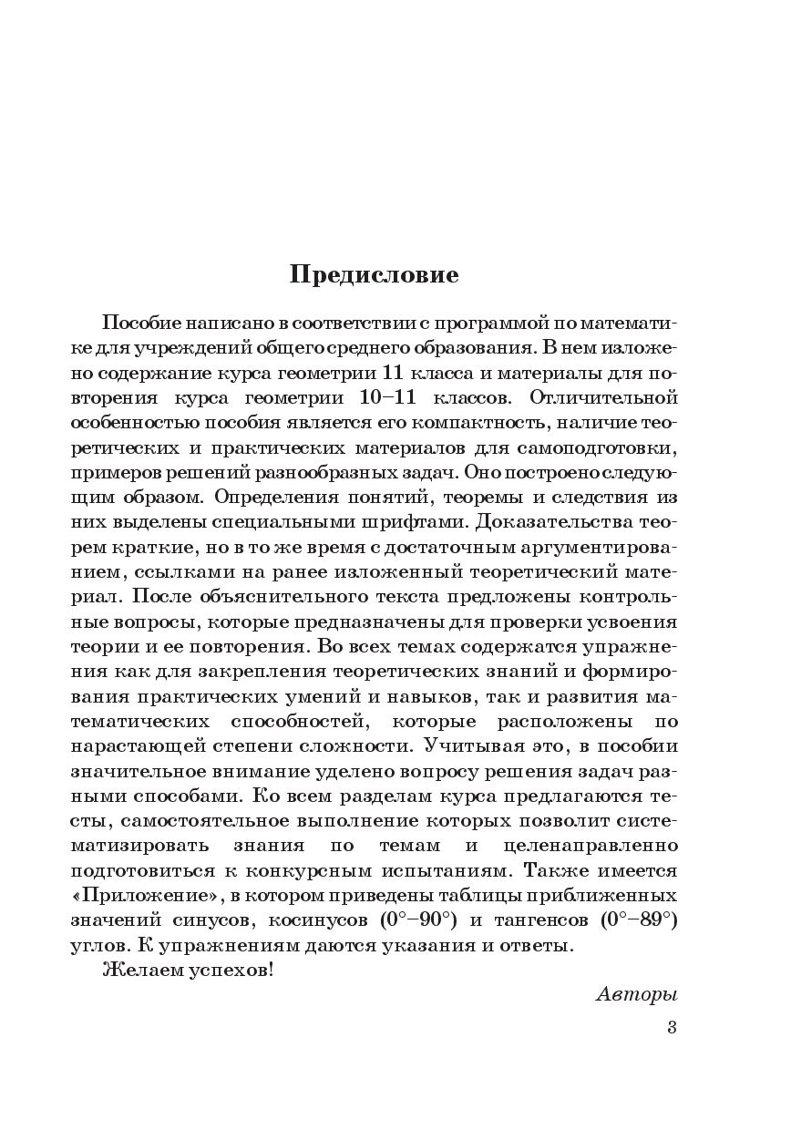 Написано в соответствии с программой по математике для учреждений общего среднего образования. В ней изложен курс геометрии 11 класса в виде теоретических и практических материалов для самоподготовки, включены тесты для систематизации знаний и закрепления практических умений и навыков за 10-11 классы.