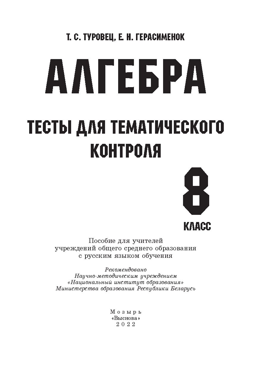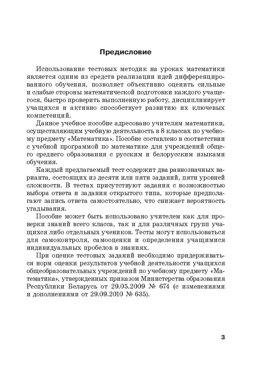 Пособие составлено в полном соответствии с учебной программой по математике и содержит тесты, предназначенные для определения уровня знаний учащихся по каждой изучаемой теме, повышения эффективности уроков, развития ключевых компетенций и самоконтроля учащихся. Отдельные фрагменты тестов могут быть использованы при устном опросе учащихся, составлении контрольных работ.