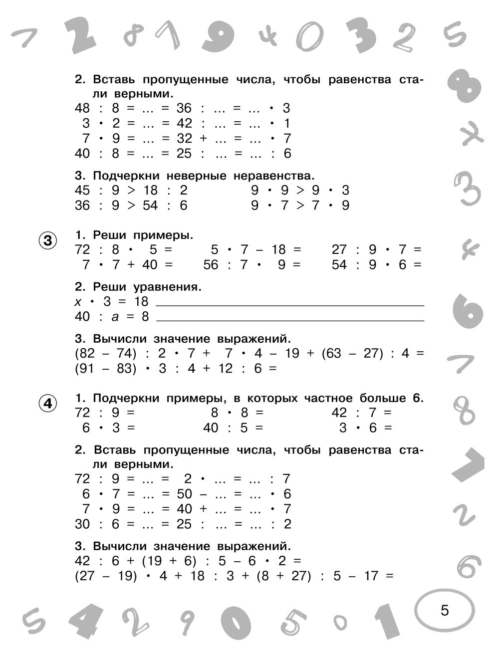 В пособие вошли примеры по математике на все темы, которые изучают в 3 классе. Для каждой темы даны четыре блока заданий по три различных мини-задания в каждом. Отработка навыков счёта до автоматизма достигается благодаря выполнению разнообразных видов заданий. В конце книги приведены подсказки – алгоритмы счёта, объясняющие последовательность вычислений.