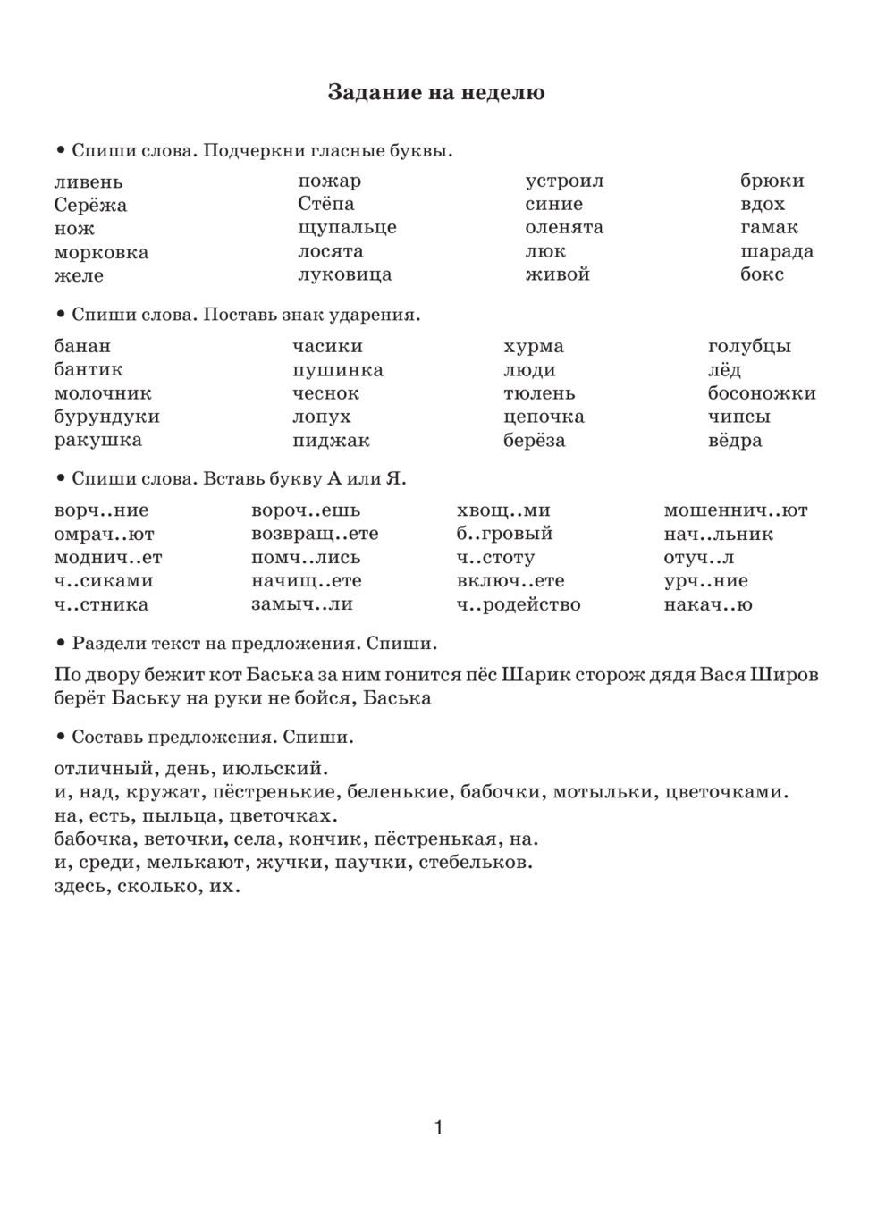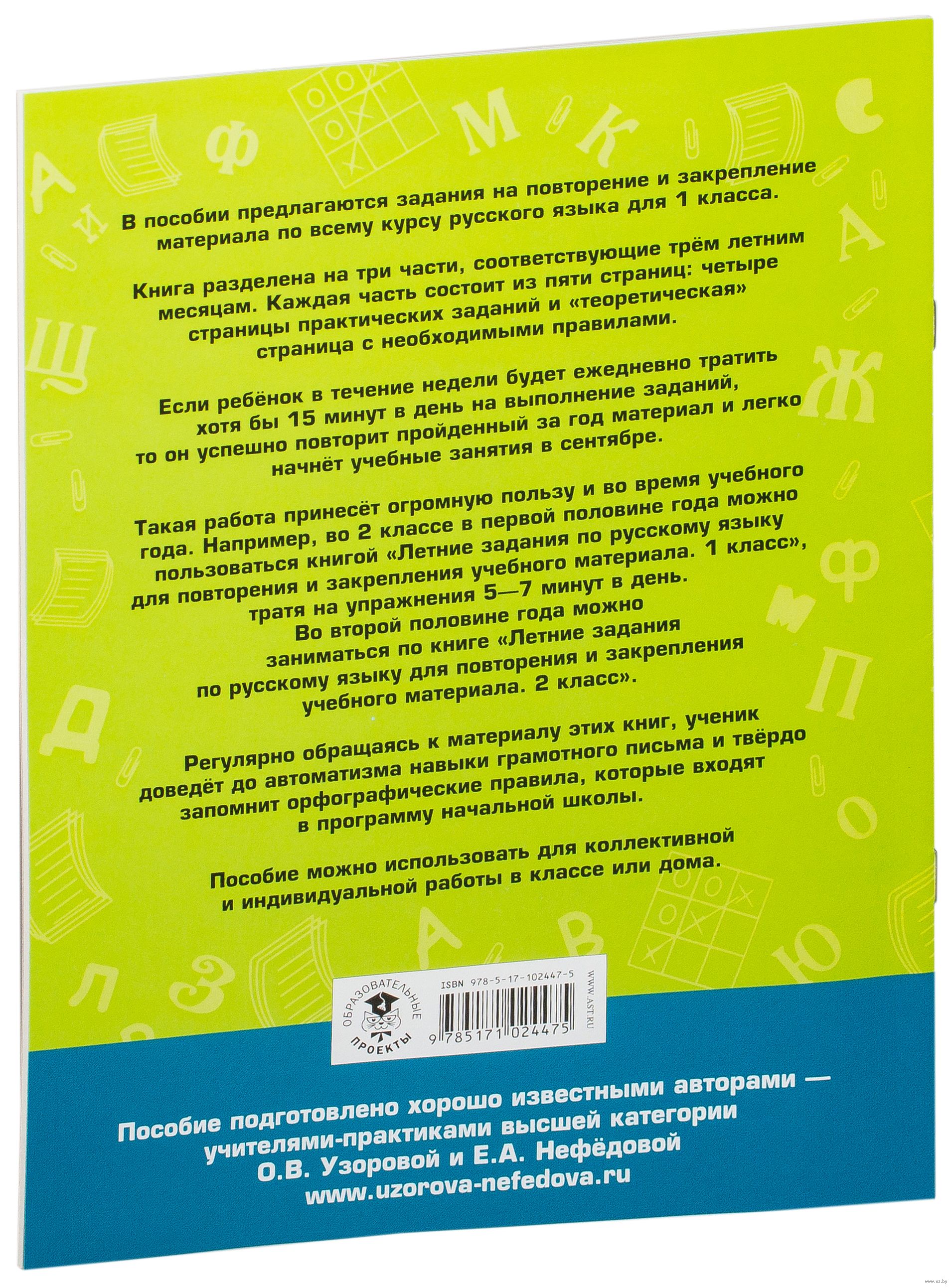 В пособии предлагаются задания на повторение и закрепление материала по всему курсу русского языка для 1 класса. Материалы книги разделены на несколько частей. За каждым блоком практических заданий следует "теоретическая" страница с необходимыми правилами. Если ребёнок будет тратить по 1 часу в неделю на выполнение этих заданий, то он успешно повторит пройденный материал и повысит свою грамотность.