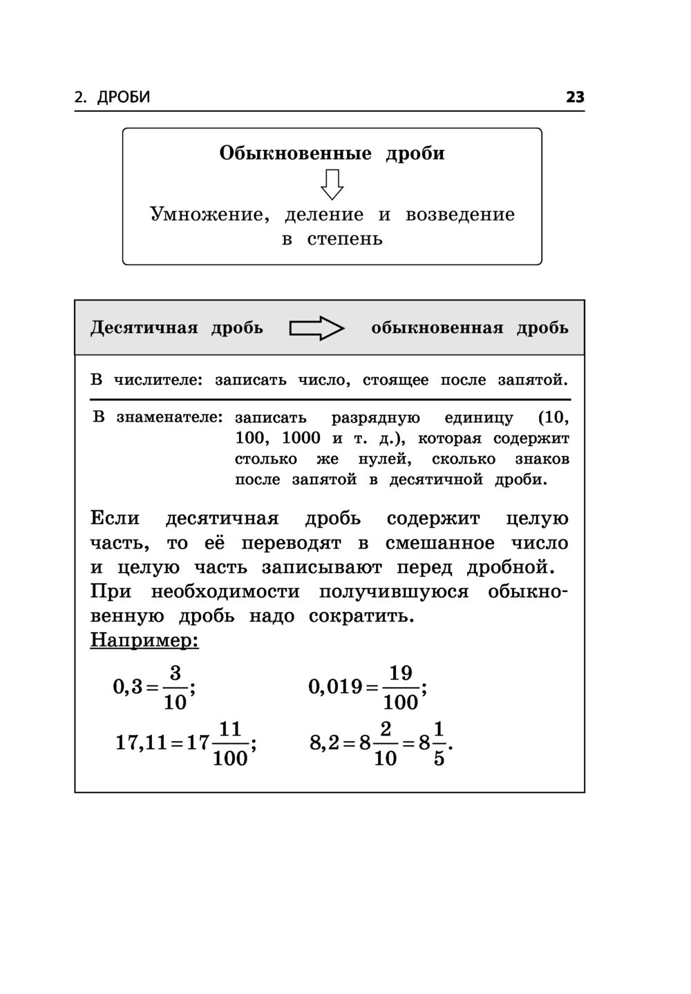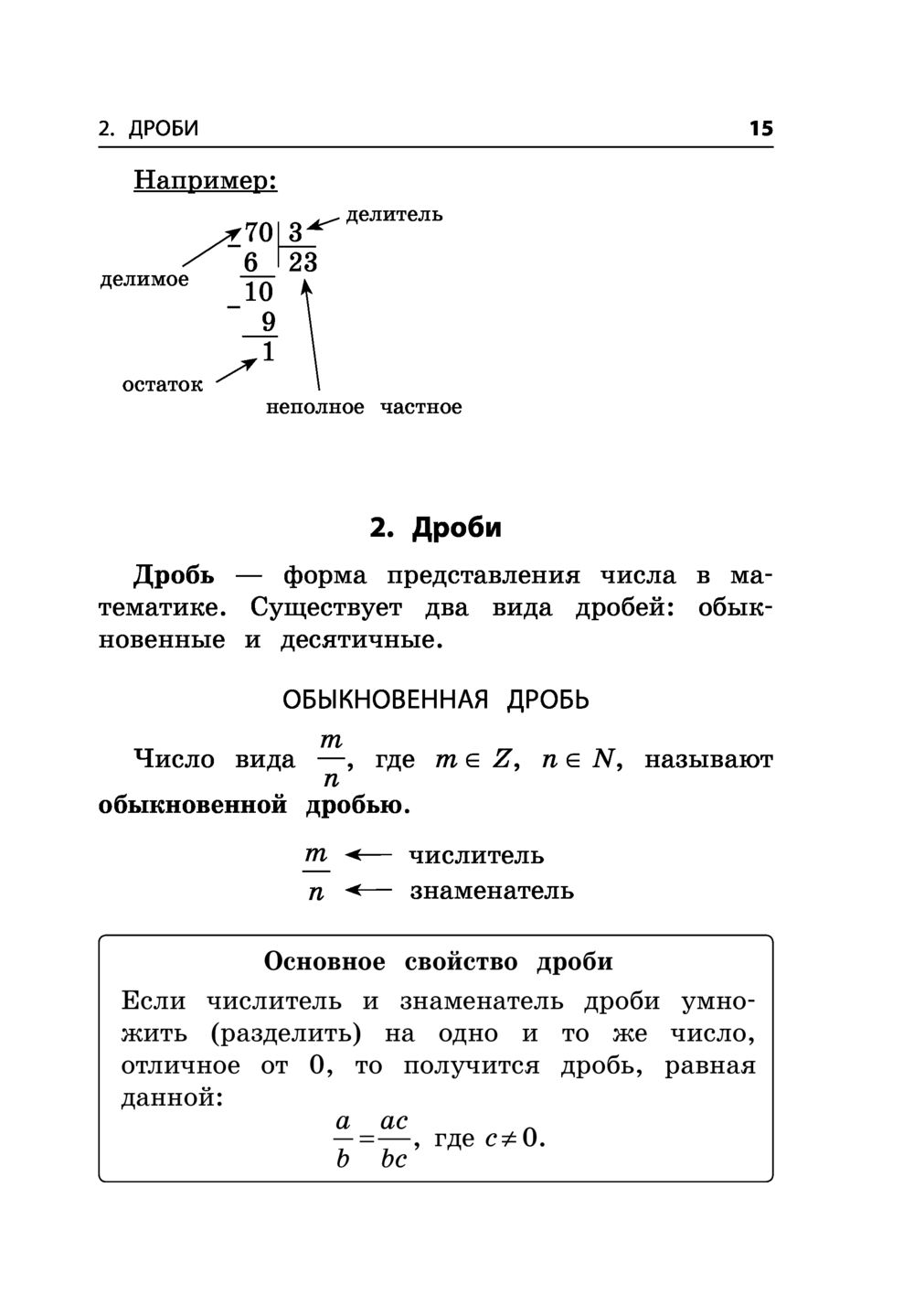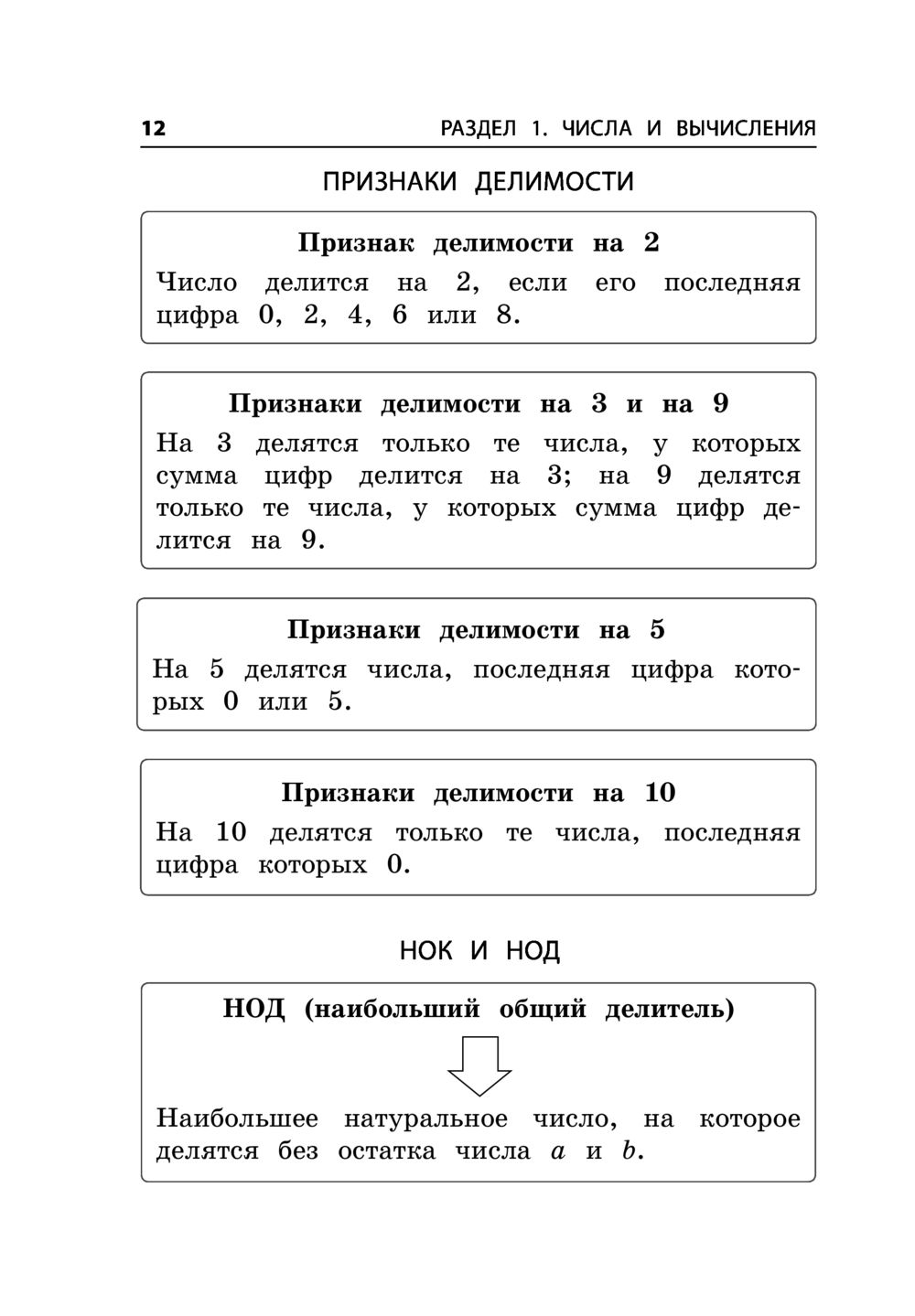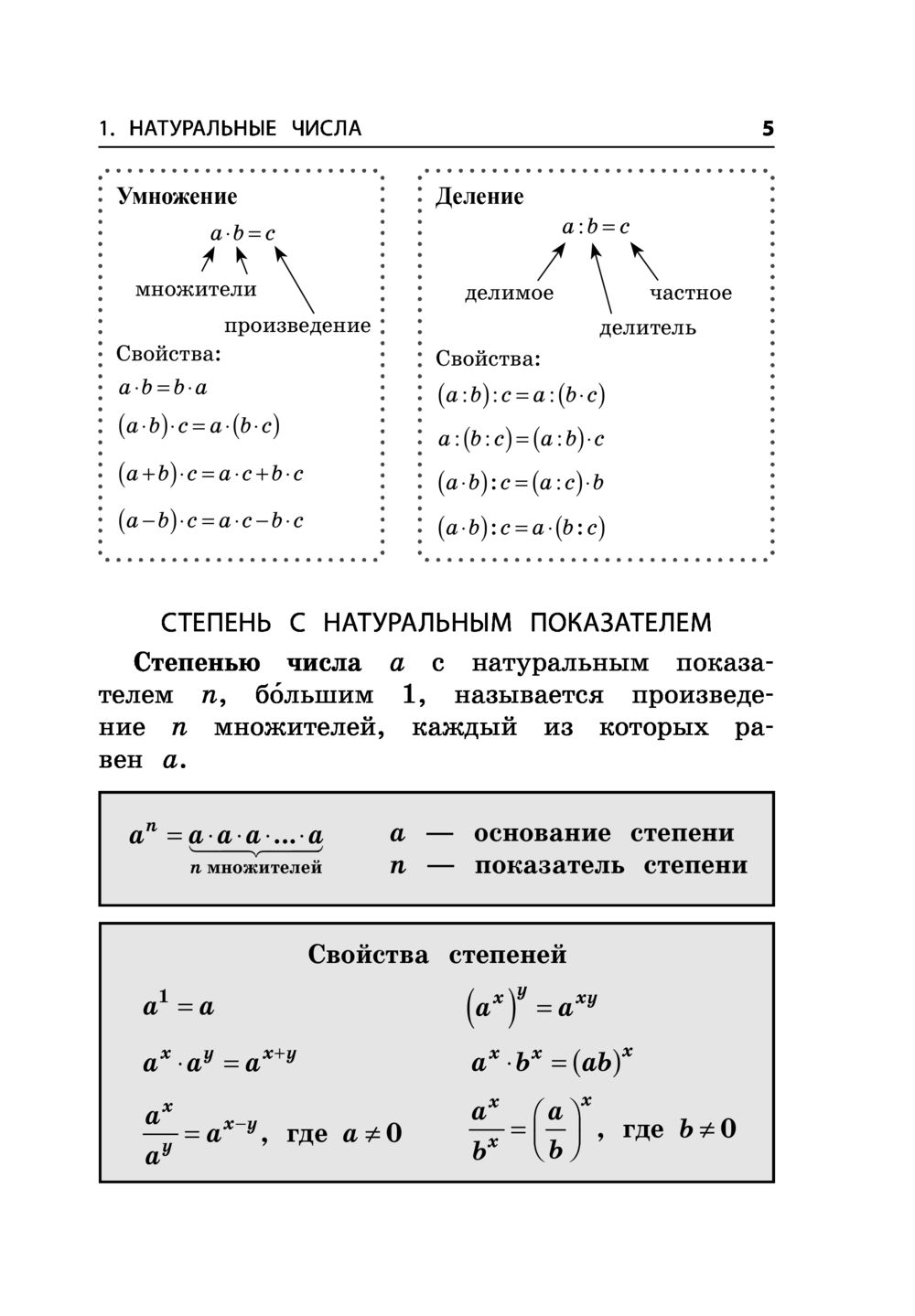 В книгу включены необходимые справочные материалы по основным разделам школьного курса, представленные в наглядных и удобных для запоминания таблицах. Приводятся определения математических понятий, формулировки правил и пояснения к ним, необходимые формулы и обучающие рисунки, а также примеры задач с решениями.