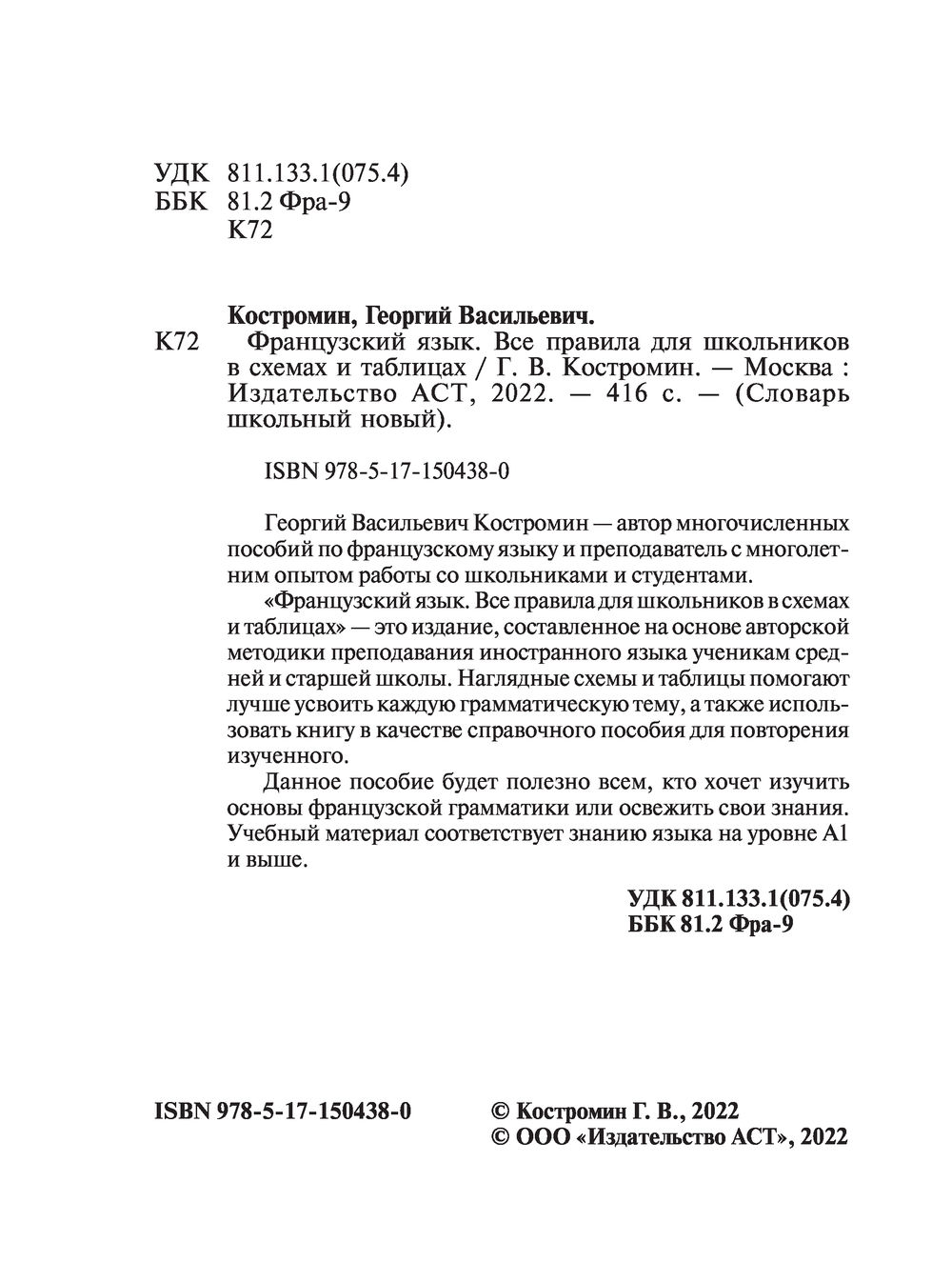 "Французский язык. Все правила для школьников в схемах и таблицах" – это издание, составленное на основе авторской методики преподавания иностранного языка ученикам средней и старшей школы. Наглядные схемы и таблицы помогают лучше усвоить каждую грамматическую тему, а также использовать книгу в качестве справочного пособия для повторения знаний.