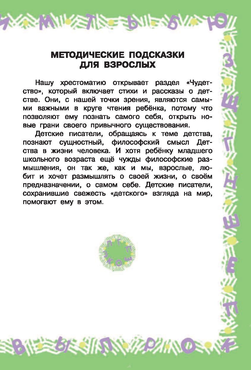В отличие от других пособий для начальной школы, в нашу хрестоматию включены не только тексты художественных произведений, но и статьи о писателях, вопросы и задания к текстам для юных читателей, методические подсказки для взрослых. Автор-составитель хрестоматии – Е. В. Посашкова,кандидат филологических наук, широко известный специалист в области русского языка и методики его преподавания в начальной школе. Надеемся, что с помощью нашей книги маленький читатель совершит самостоятельное путешествие в увлекательный мир литературы, научится вместе с героями книг думать, фантазировать, творить. И тогда перед ним откроется огромная и удивительная страна, населённая поэтами,сказочниками, весёлыми и добрыми людьми...