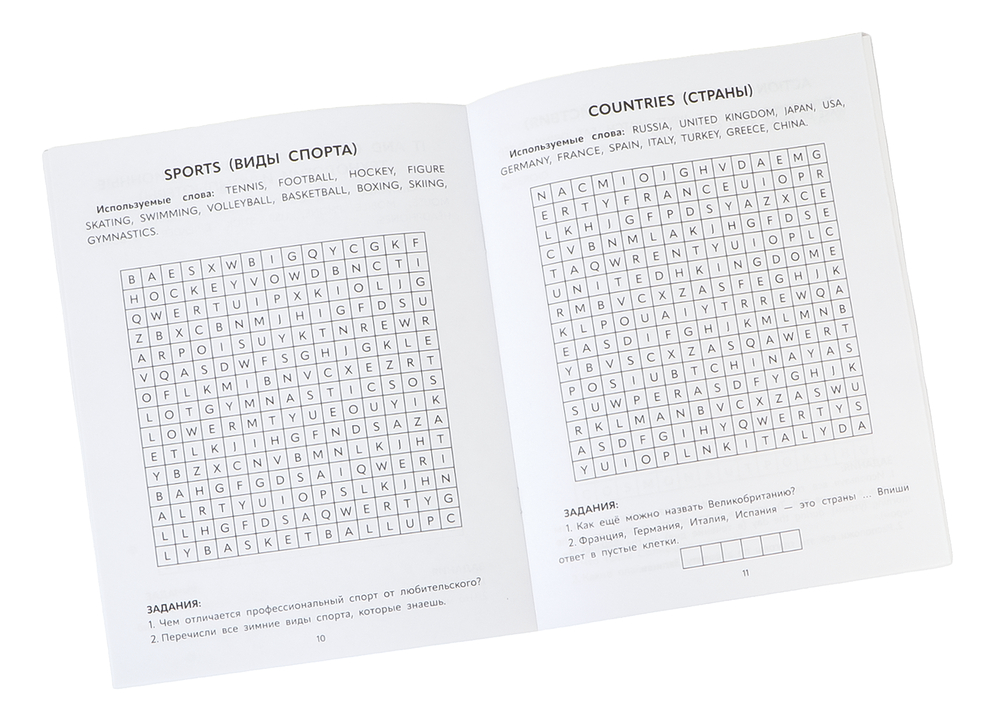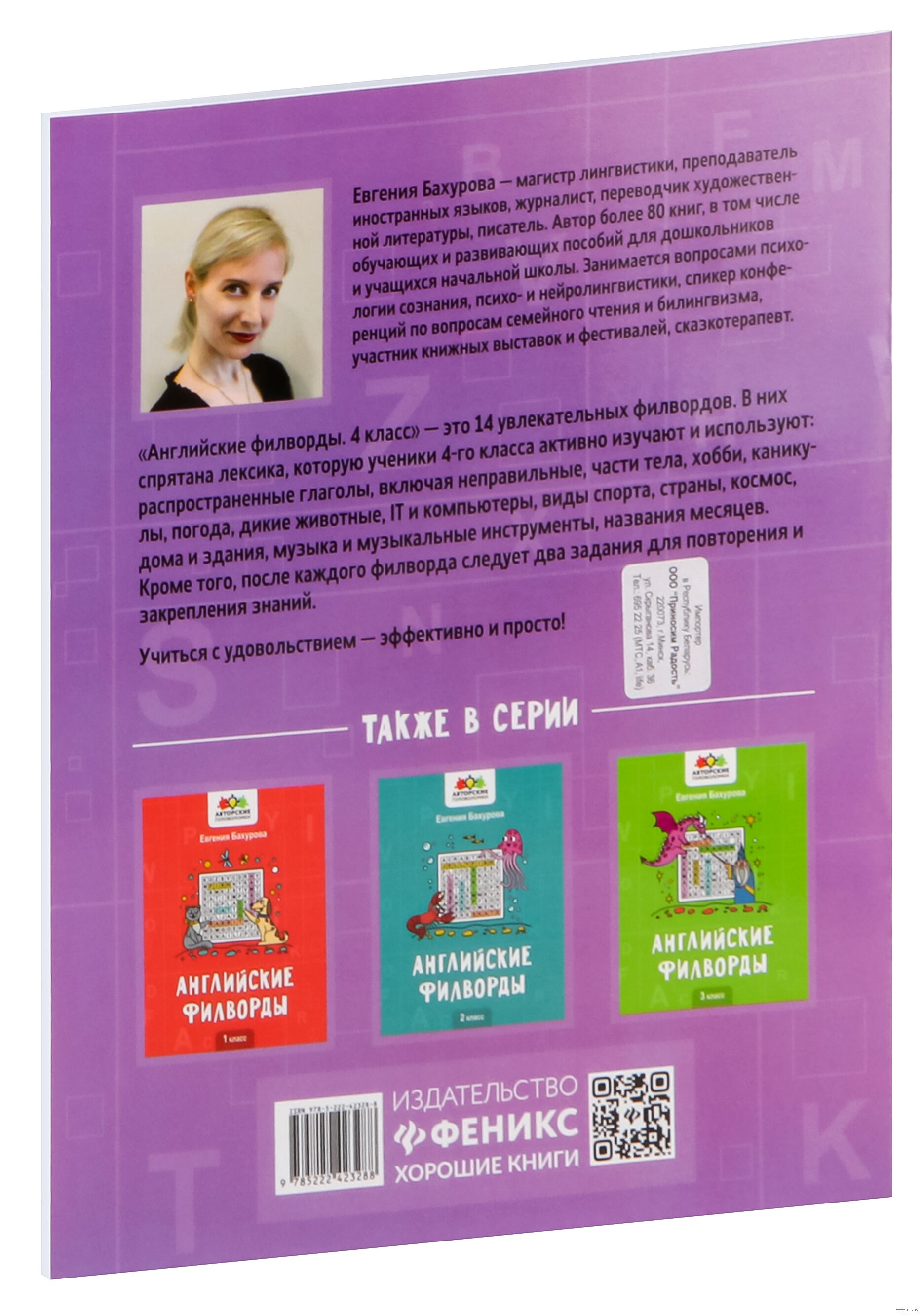 "Английские филворды. 4 класс" – это 14 увлекательных филвордов. В них спрятана лексика, которую ученики 4-го класса активно изучают и используют: распространённые глаголы, включая неправильные, части тела, хобби, каникулы, погода, дикие животные, IT и компьютеры, виды спорта, страны, космос, дома и здания, музыка и музыкальные инструменты, названия месяцев. Кроме того, после каждого филворда следует два задания для повторения и закрепления знаний.
